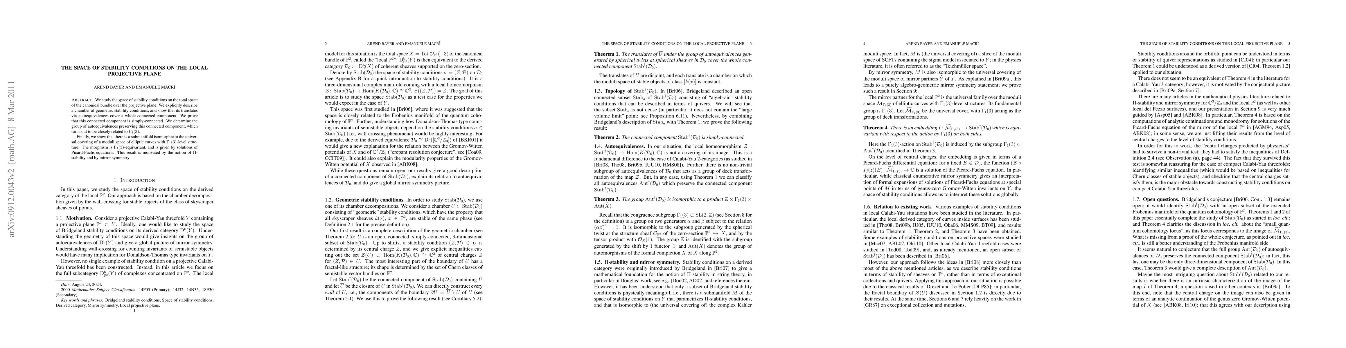 Researchers studied stability conditions on the total space of a canonical bundle over the projective plane, finding a connected component that is simply-connected and related to the group Gamma1(3), with implications for moduli spaces of elliptic curves.