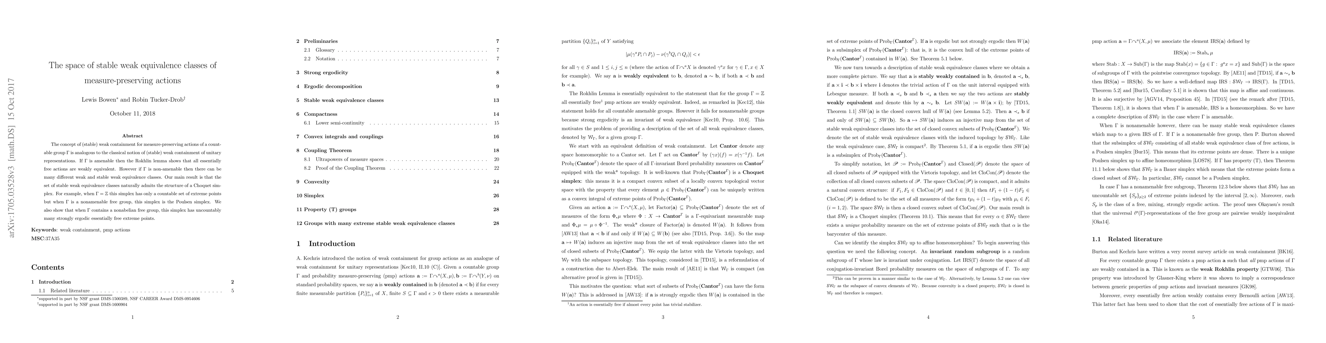 This paper explores the stable weak equivalence classes of measure-preserving actions of countable groups, demonstrating that when the group is non-amenable, these classes form a Choquet simplex. The structure varies significantly depending on the group, with free groups leading to a Poulsen simplex and uncountably many strongly ergodic points.
