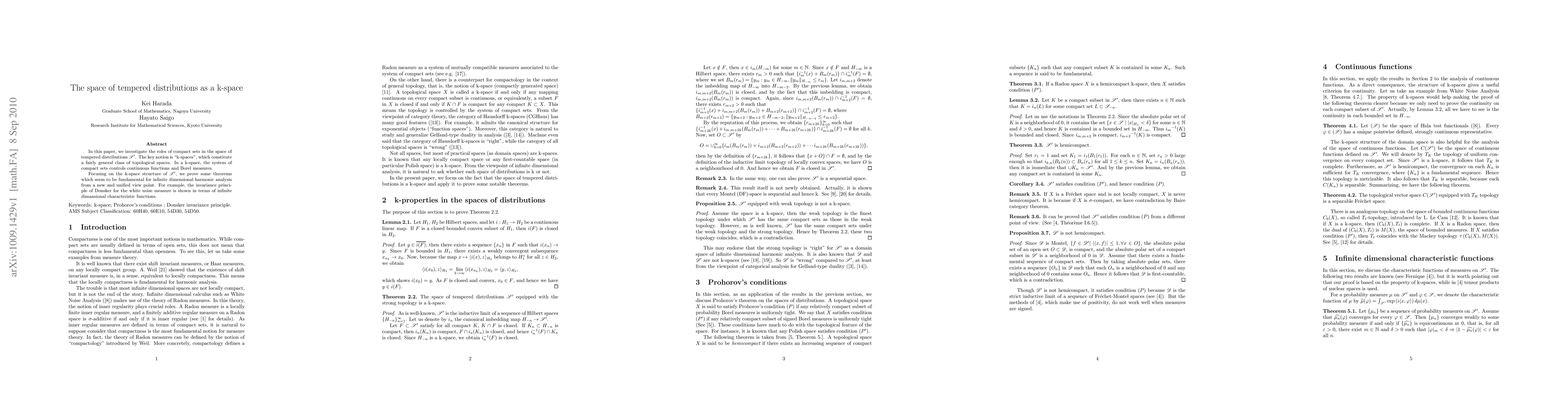 In this paper, we investigate the roles of compact sets in the space of tempered distributions $\mathscr{S}^{\prime}$. The key notion is "k-spaces", which constitute a fairly general class of topological spaces. In a k-space, the system of compact sets controls continuous functions and Borel measures. Focusing on the k-space structure of $\mathscr{S}^{\prime}$, we prove some theorems which seem to be fundamental for infinite dimensional harmonic analysis from a new and unified view point. For example, the invariance principle of Donsker for the white noise measure is shown in terms of infinite dimansional characteristic functions.