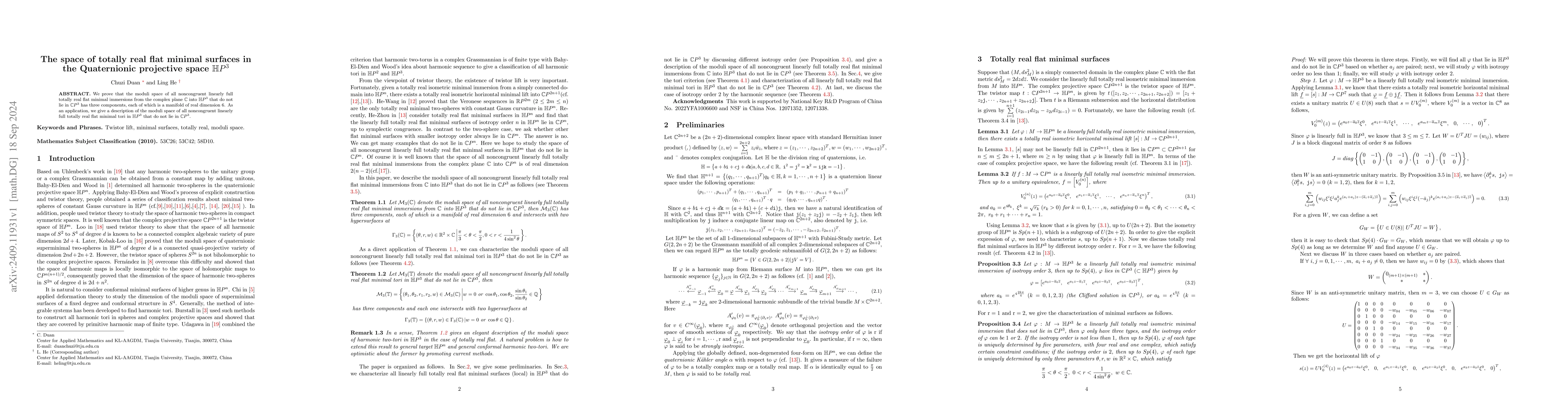 We prove that the moduli space of all noncongruent linearly full totally real flat minimal immersions from the complex plane C into HP^3 that do not lie in CP^3 has three components, each of which is a manifold of real dimension 6. As an application, we give a description of the moduli space of all noncongruent linearly full totally real flat minimal tori in HP^3 that do not lie in CP^3.