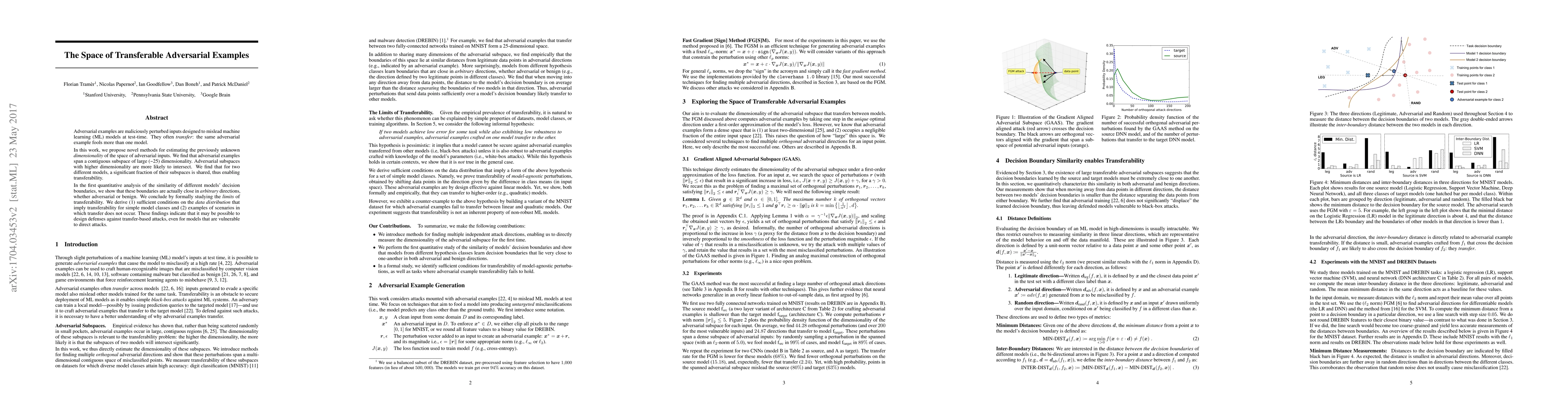 This paper investigates the dimensionality of the space of transferable adversarial examples, revealing that they span a large (~25) dimensional subspace. The study finds significant overlap between the subspaces of different models, explaining their transferability, and analyzes the proximity of decision boundaries to suggest potential avenues for defense against transfer-based attacks.