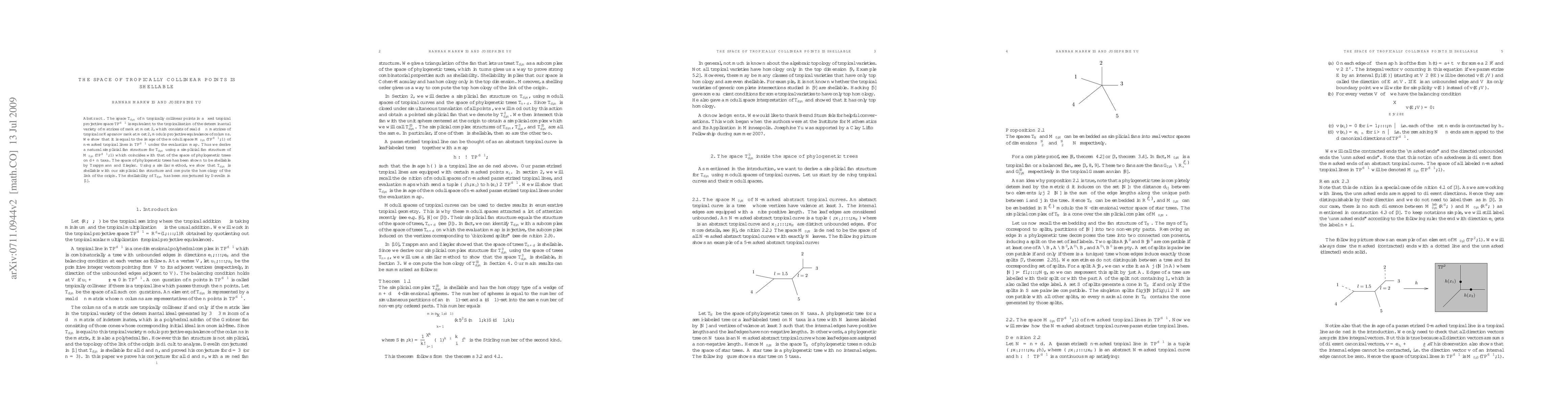 The paper demonstrates that the space of tropically collinear points T_{d,n} is shellable by establishing a natural simplicial fan structure derived from the moduli space of n-marked tropical lines. This shellability confirms a conjecture by Develin and computes the homology of the link of the origin.