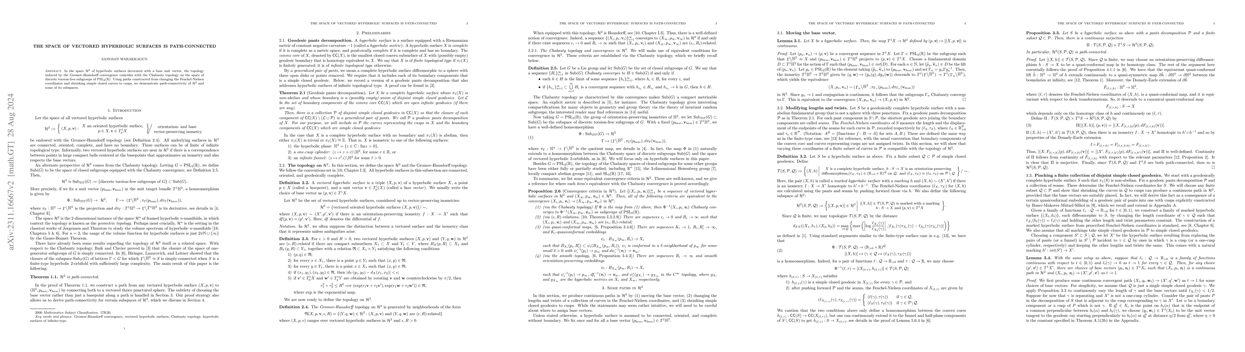 The paper demonstrates that the space $\mathcal{H}^2$ of vectored hyperbolic surfaces is path-connected by constructing paths through changes in Fenchel-Nielsen coordinates and curve shrinking to cusps. This path-connectivity is shown under the Gromov-Hausdorff and Chabauty topologies.
