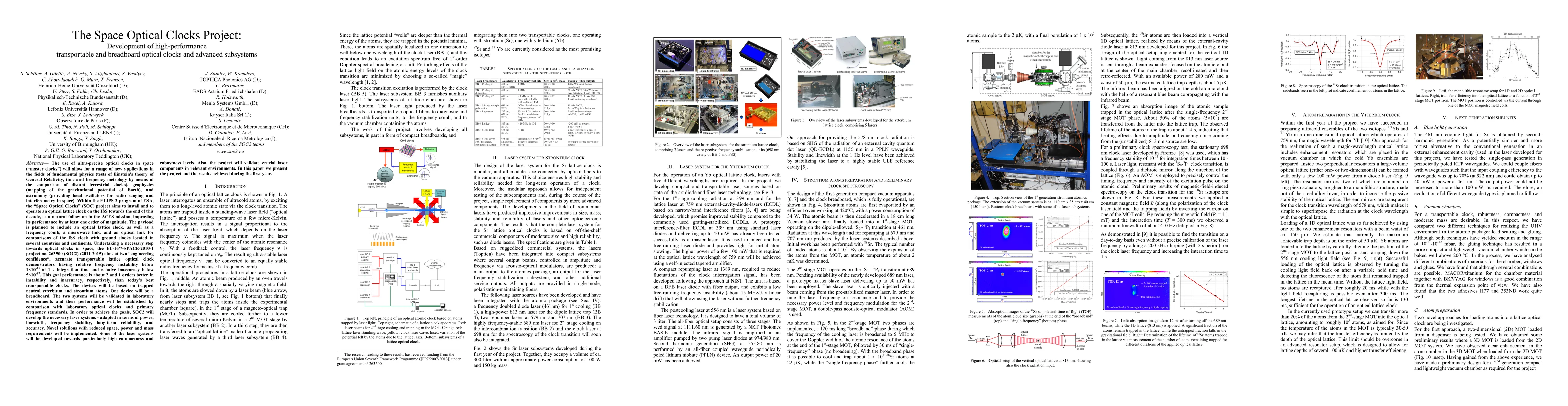 The use of ultra-precise optical clocks in space ("master clocks") will allow for a range of new applications in the fields of fundamental physics (tests of Einstein's theory of General Relativity, time and frequency metrology by means of the comparison of distant terrestrial clocks), geophysics (mapping of the gravitational potential of Earth), and astronomy (providing local oscillators for radio ranging and interferometry in space). Within the ELIPS-3 program of ESA, the "Space Optical Clocks" (SOC) project aims to install and to operate an optical lattice clock on the ISS towards the end of this decade, as a natural follow-on to the ACES mission, improving its performance by at least one order of magnitude. The payload is planned to include an optical lattice clock, as well as a frequency comb, a microwave link, and an optical link for comparisons of the ISS clock with ground clocks located in several countries and continents. Undertaking a necessary step towards optical clocks in space, the EU-FP7-SPACE-2010-1 project no. 263500 (SOC2) (2011-2015) aims at two "engineering confidence", accurate transportable lattice optical clock demonstrators having relative frequency instability below 1\times10^-15 at 1 s integration time and relative inaccuracy below 5\times10^-17. This goal performance is about 2 and 1 orders better in instability and inaccuracy, respectively, than today's best transportable clocks. The devices will be based on trapped neutral ytterbium and strontium atoms. One device will be a breadboard. The two systems will be validated in laboratory environments and their performance will be established by comparison with laboratory optical clocks and primary frequency standards. In this paper we present the project and the results achieved during the first year.