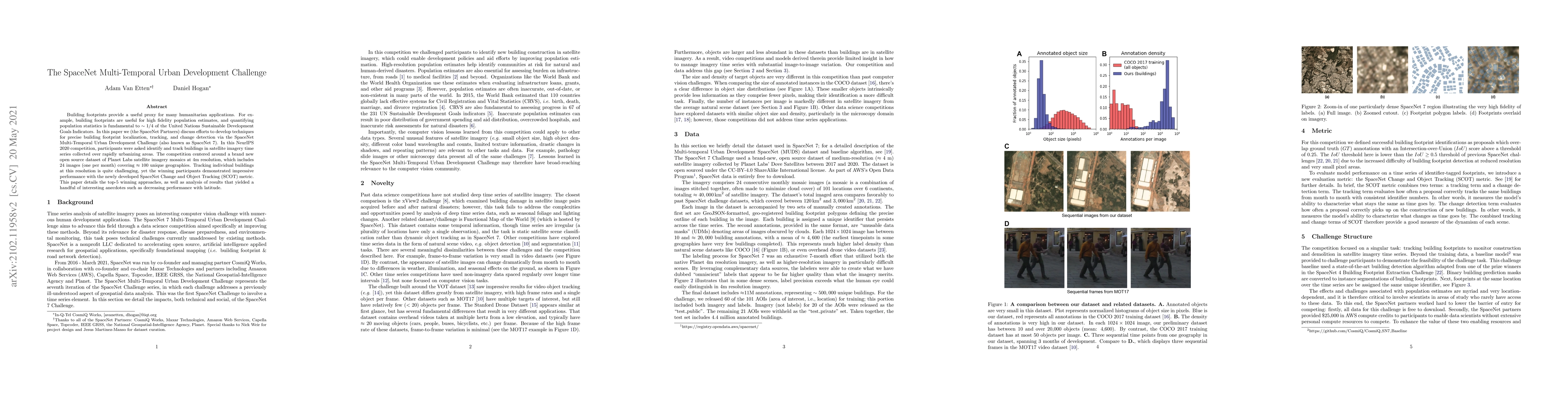 Building footprints provide a useful proxy for a great many humanitarian applications. For example, building footprints are useful for high fidelity population estimates, and quantifying population statistics is fundamental to ~1/4 of the United Nations Sustainable Development Goals Indicators. In this paper we (the SpaceNet Partners) discuss efforts to develop techniques for precise building footprint localization, tracking, and change detection via the SpaceNet Multi-Temporal Urban Development Challenge (also known as SpaceNet 7). In this NeurIPS 2020 competition, participants were asked identify and track buildings in satellite imagery time series collected over rapidly urbanizing areas. The competition centered around a brand new open source dataset of Planet Labs satellite imagery mosaics at 4m resolution, which includes 24 images (one per month) covering ~100 unique geographies. Tracking individual buildings at this resolution is quite challenging, yet the winning participants demonstrated impressive performance with the newly developed SpaceNet Change and Object Tracking (SCOT) metric. This paper details the top-5 winning approaches, as well as analysis of results that yielded a handful of interesting anecdotes such as decreasing performance with latitude.