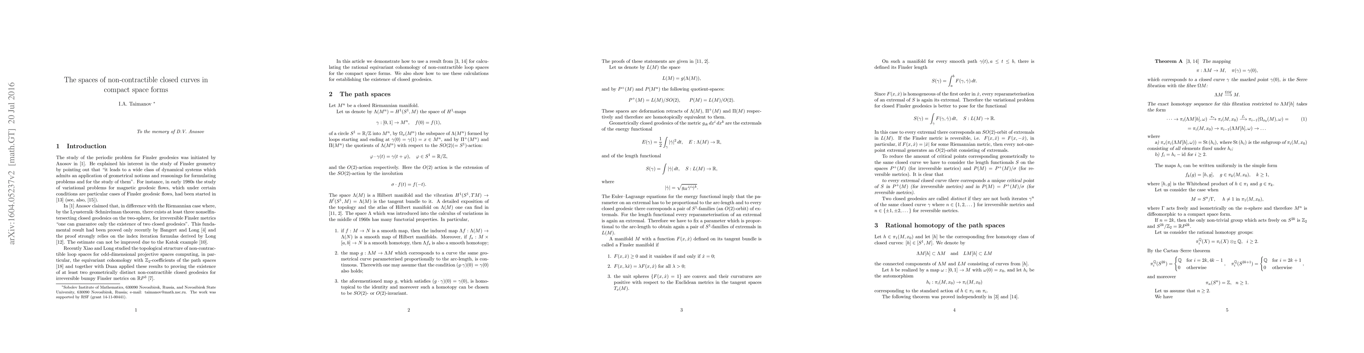 This paper calculates the rational equivariant cohomology of spaces of non-contractible closed curves in compact space forms, and uses these findings to demonstrate the existence of closed geodesics.