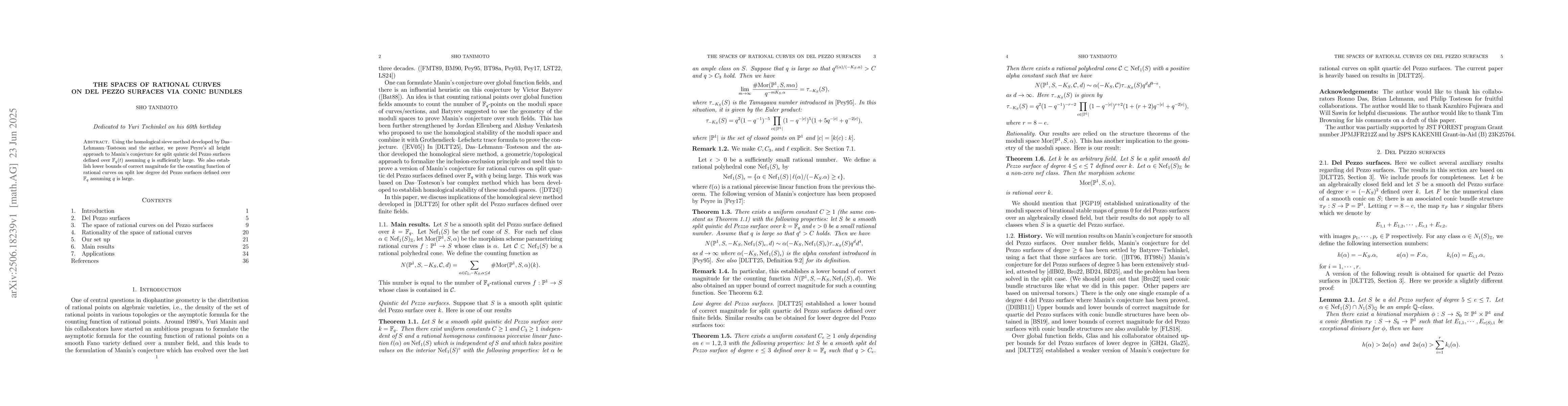This research applies the homological sieve method to prove Peyre's approach for Manin's conjecture on split quintic del Pezzo surfaces over $mathbb F_q(t)$ for sufficiently large $q$. It also provides lower bounds for counting rational curves on low degree del Pezzo surfaces over $mathbb F_q$, assuming large $q$.
