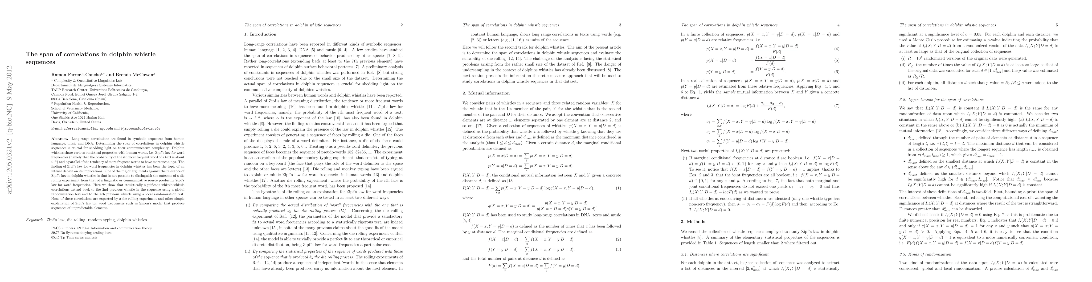 Long-range correlations are found in symbolic sequences from human language, music and DNA. Determining the span of correlations in dolphin whistle sequences is crucial for shedding light on their communicative complexity. Dolphin whistles share various statistical properties with human words, i.e. Zipf's law for word frequencies (namely that the probability of the $i$th most frequent word of a text is about $i^{-\alpha}$) and a parallel of the tendency of more frequent words to have more meanings. The finding of Zipf's law for word frequencies in dolphin whistles has been the topic of an intense debate on its implications. One of the major arguments against the relevance of Zipf's law in dolphin whistles is that is not possible to distinguish the outcome of a die rolling experiment from that of a linguistic or communicative source producing Zipf's law for word frequencies. Here we show that statistically significant whistle-whistle correlations extend back to the 2nd previous whistle in the sequence using a global randomization test and to the 4th previous whistle using a local randomization test. None of these correlations are expected by a die rolling experiment and other simple explanation of Zipf's law for word frequencies such as Simon's model that produce sequences of unpredictable elements.