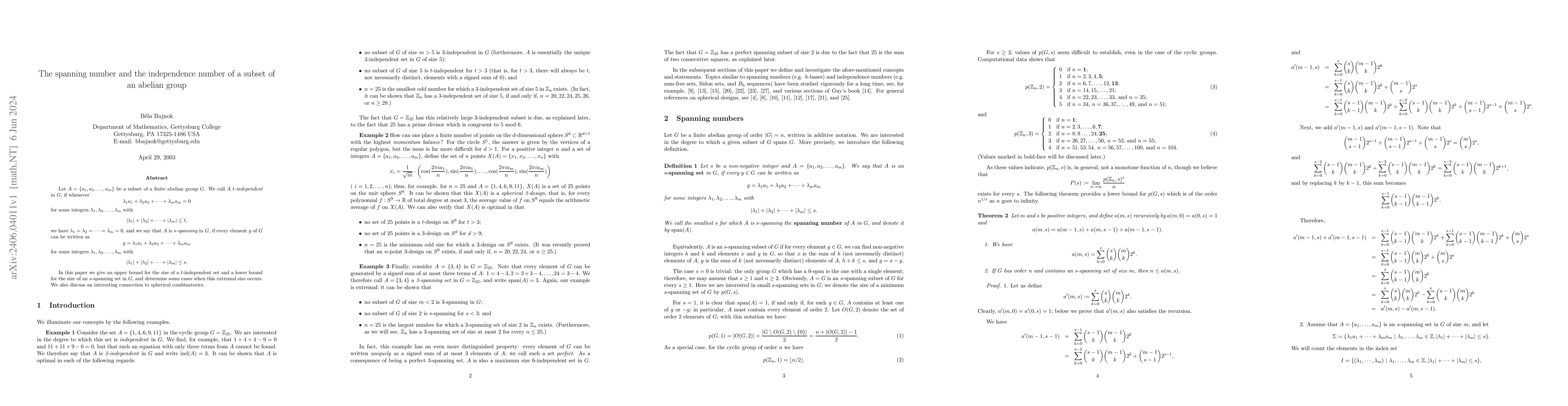 This paper investigates subsets $A$ of a finite abelian group $G$, defining $t$-independence and $s$-spanning properties, and provides bounds on their sizes along with conditions under which these bounds are achieved, linking the results to spherical combinatorics.
