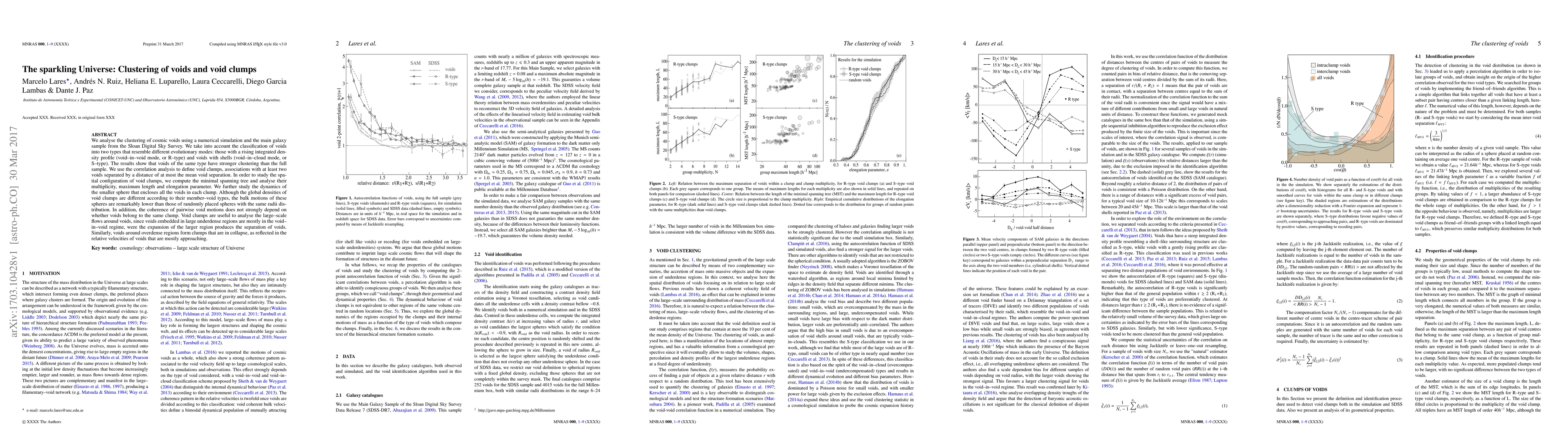 We analyse the clustering of cosmic voids using a numerical simulation and the main galaxy sample from the Sloan Digital Sky Survey. We take into account the classification of voids into two types that resemble different evolutionary modes: those with a rising integrated density profile (void-in-void mode, or R-type) and voids with shells (void-in-cloud mode, or S-type). The results show that voids of the same type have stronger clustering than the full sample. We use the correlation analysis to define void clumps, associations with at least two voids separated by a distance of at most the mean void separation. In order to study the spatial configuration of void clumps, we compute the minimal spanning tree and analyse their multiplicity, maximum length and elongation parameter. We further study the dynamics of the smaller sphere that encloses all the voids in each clump. Although the global densities of void clumps are different according to their member-void types, the bulk motions of these spheres are remarkably lower than those of randomly placed spheres with the same radii distribution. In addition, the coherence of pairwise void motions does not strongly depend on whether voids belong to the same clump. Void clumps are useful to analyse the large-scale flows around voids, since voids embedded in large underdense regions are mostly in the void-in-void regime, were the expansion of the larger region produces the separation of voids. Similarly, voids around overdense regions form clumps that are in collapse, as reflected in the relative velocities of voids that are mostly approaching.