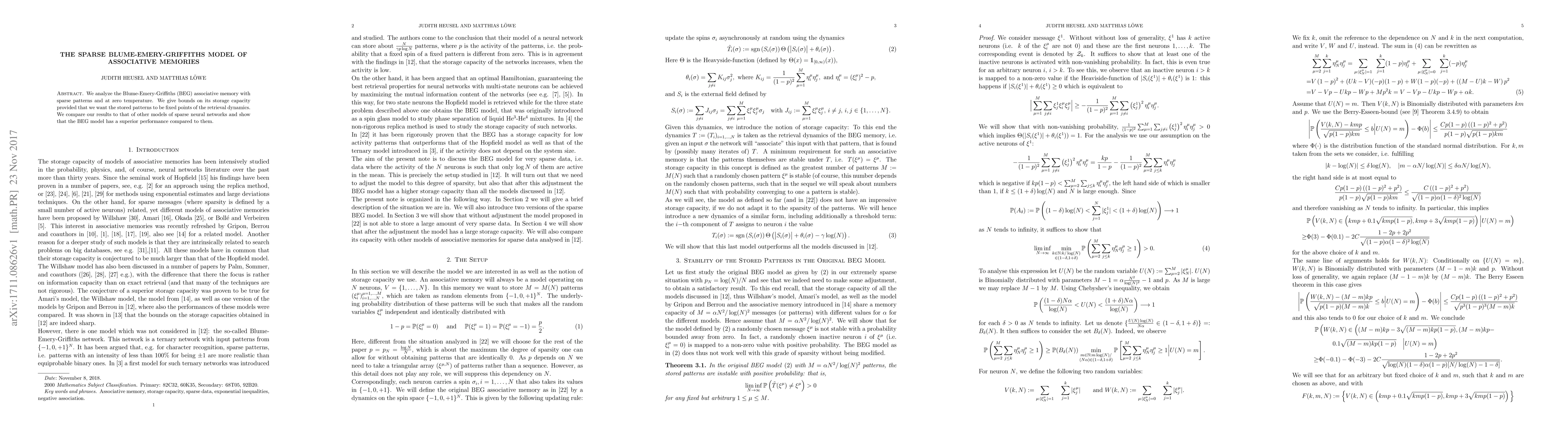This paper analyzes the Blume-Emery-Griffiths (BEG) model for associative memories with sparse patterns at zero temperature, providing bounds on its storage capacity for fixed point retrieval. The BEG model is shown to outperform other sparse neural network models in terms of performance.