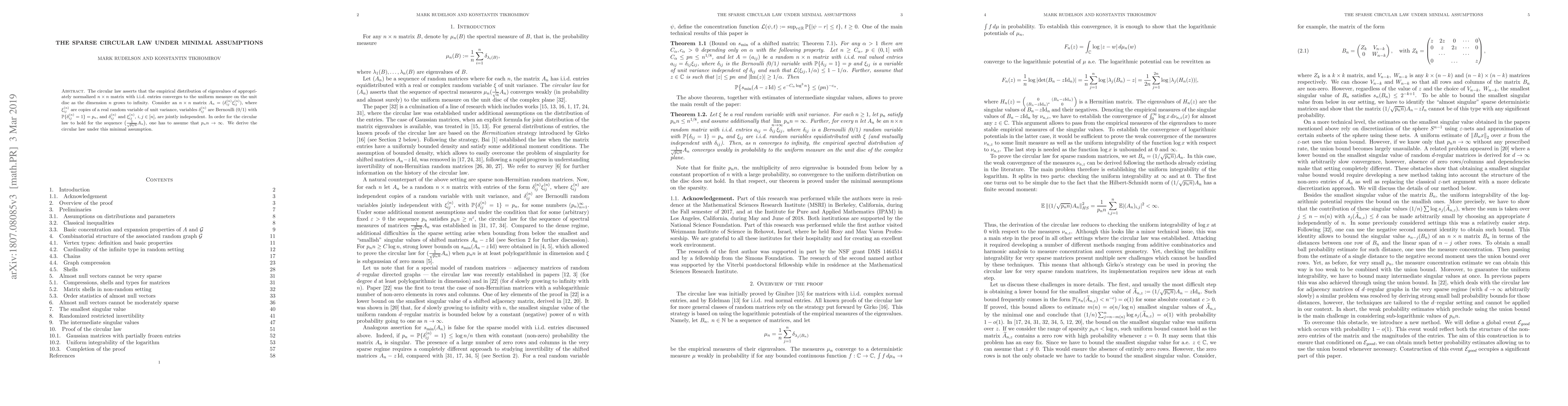 This paper establishes the circular law for sparse random matrices under minimal assumptions, proving that the eigenvalue distribution of appropriately normalized $n\times n$ matrices with Bernoulli-weighted i.i.d. entries converges to the uniform measure on the unit disc as $n$ tends to infinity, provided $p_n n \to \infty$.