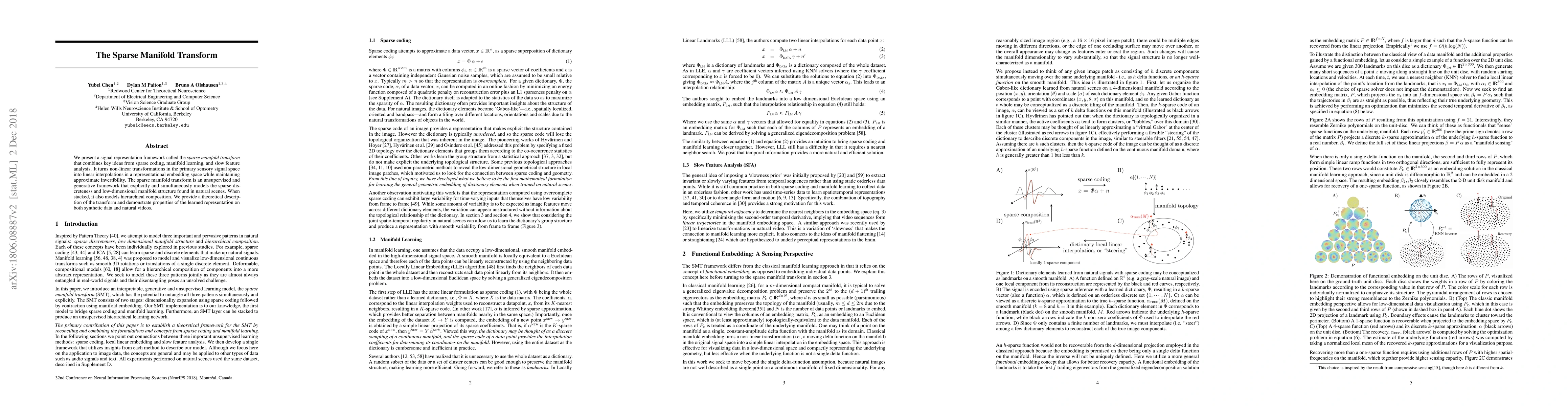 The Sparse Manifold Transform framework combines sparse coding, manifold learning, and slow feature analysis to model non-linear transformations in sensory signal spaces while maintaining invertibility and hierarchical composition. It provides an unsupervised, generative representation of natural scenes and demonstrates its properties on synthetic data and natural videos.