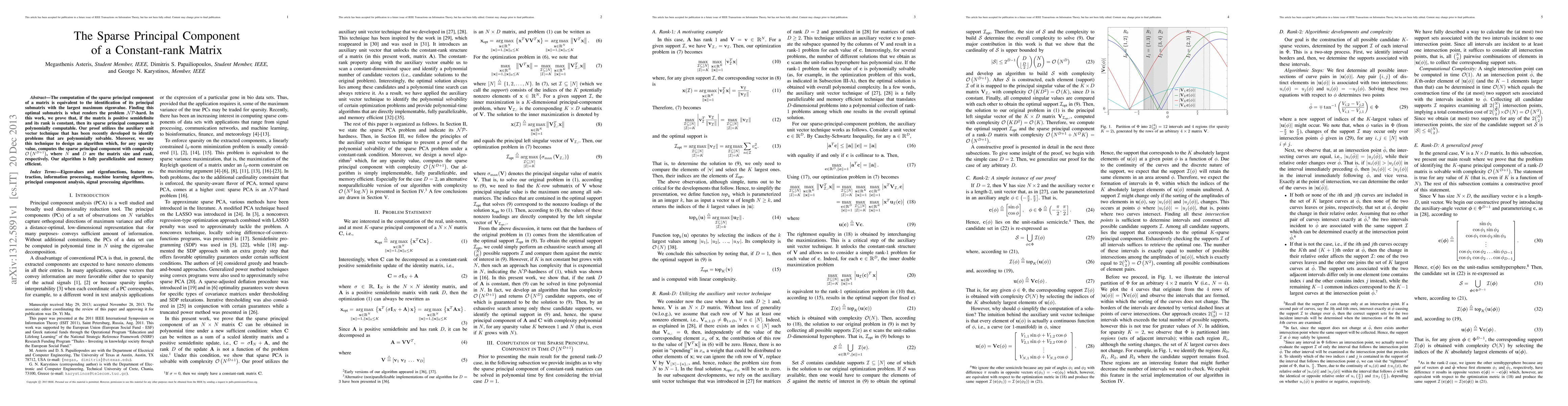 This research demonstrates that the sparse principal component of a constant-rank, positive semidefinite matrix can be computed polynomially using an auxiliary unit vector technique. The proposed algorithm achieves complexity ${\mathcal O}\left(N^{D+1}\right)$ and is both parallelizable and memory efficient.