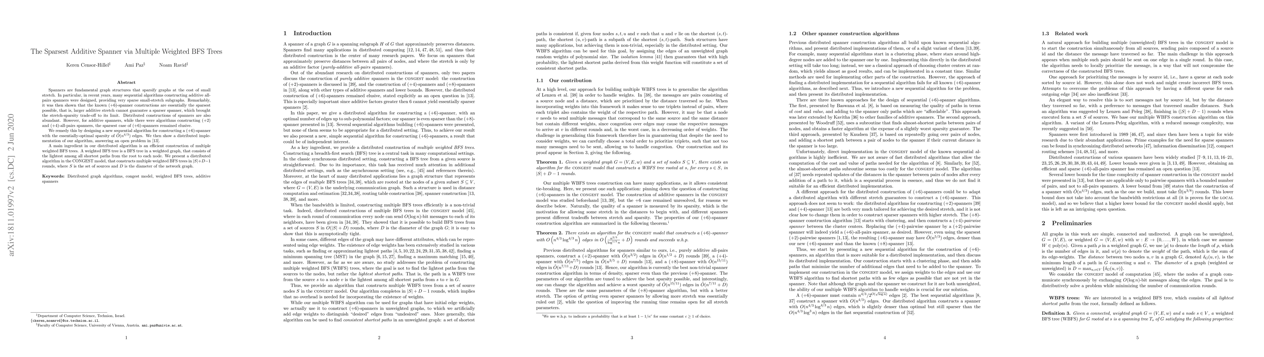 Spanners are fundamental graph structures that sparsify graphs at the cost of small stretch. In particular, in recent years, many sequential algorithms constructing additive all-pairs spanners were designed, providing very sparse small-stretch subgraphs. Remarkably, it was then shown that the known (+6)-spanner constructions are essentially the sparsest possible, that is, a larger additive stretch cannot guarantee a sparser spanner, which brought the stretch-sparsity trade-off to its limit. Distributed constructions of spanners are also abundant. However, for additive spanners, while there were algorithms constructing (+2) and (+4)-all-pairs spanners, the sparsest case of (+6)-spanners remained elusive. We remedy this by designing a new sequential algorithm for constructing a (+6)-spanner with the essentially-optimal sparsity of roughly O(n^{4/3}) edges. We then show a distributed implementation of our algorithm, answering an open problem in [Censor-Hillel et al., DISC 2016]. A main ingredient in our distributed algorithm is an efficient construction of multiple weighted BFS trees. A weighted BFS tree is a BFS tree in a weighted graph, that consists of the lightest among all shortest paths from the root to each node. We present a distributed algorithm in the CONGEST model, that constructs multiple weighted BFS trees in |S|+D-1 rounds, where S is the set of sources and D is the diameter of the network graph.