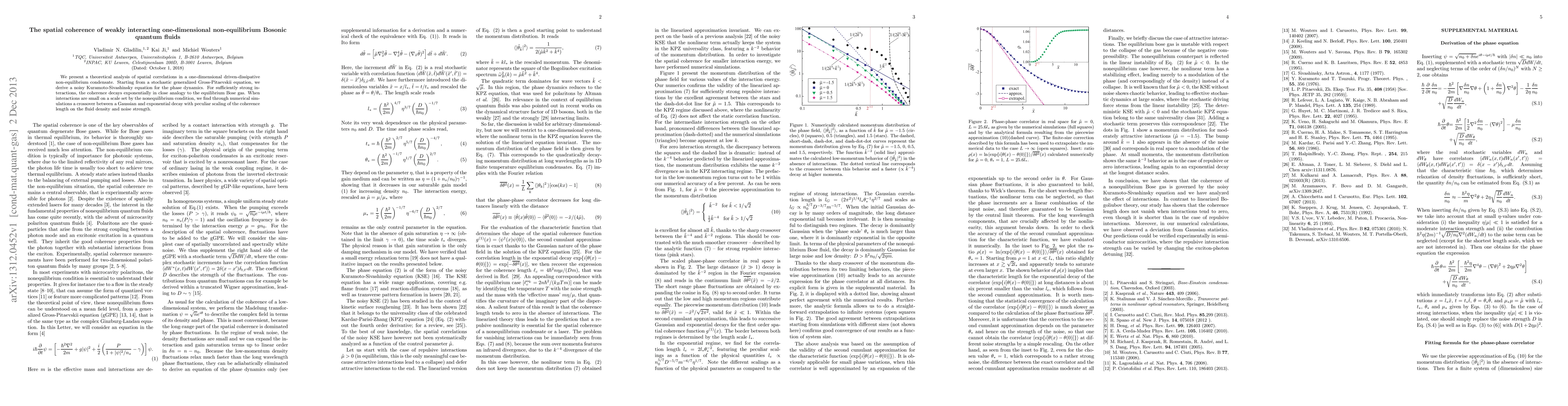 This paper theoretically analyzes spatial correlations in a one-dimensional non-equilibrium bosonic quantum fluid, deriving a Kuramoto-Sivashinsky equation for phase dynamics. It finds that coherence decays exponentially for strong interactions but exhibits a crossover between Gaussian and exponential decay for weak interactions, influenced by fluid density and noise strength.
