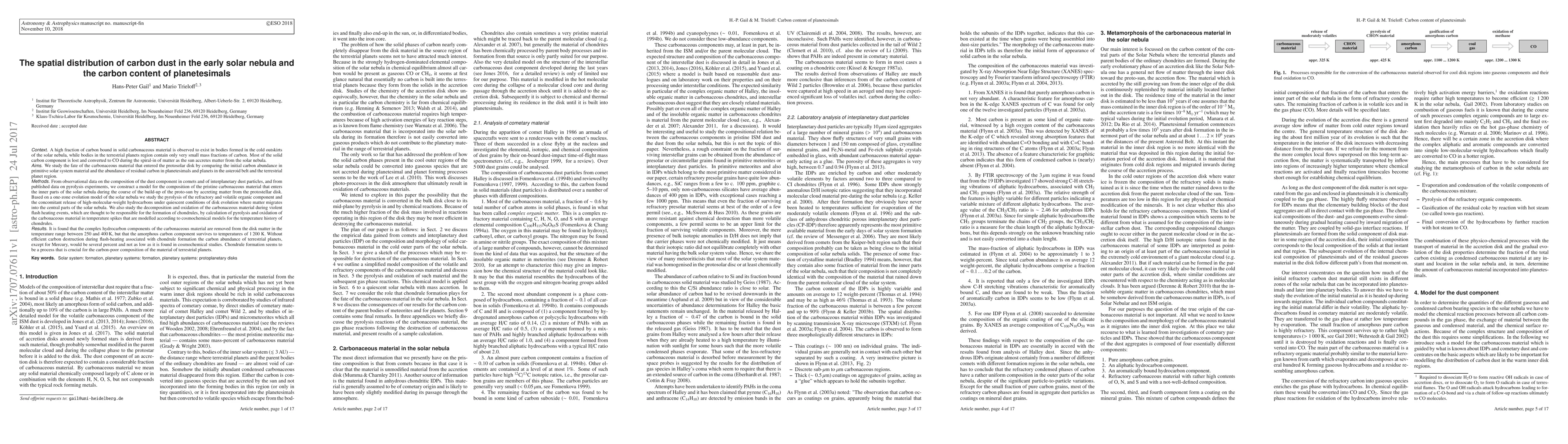 A high fraction of carbon bound in solid carbonaceous material is observed to exist in bodies formed in the cold outskirts of the solar nebula, while bodies in the terrestrial planets region contain nearly none. We study the fate of the carbonaceous material during the spiral-in of matter as the sun accretes matter from the solar nebula. From observational data on the composition of the dust component in comets and interplanetary dust particles, and from data on pyrolysis experiments, we construct a model for the composition of the pristine carbonaceous material in the outer parts of the solar nebula. We study the pyrolysis of the refractory and volatile organic component and the concomitant release of high-molecular-weight hydrocarbons under quiescent conditions of disk evolution where matter migrates inwards. We also study the decomposition and oxidation of the carbonaceous material during violent flash heating events, which are thought to be responsible for the formation of chondrules. It is found that the complex hydrocarbon components are removed from the solid disk matter at temperatures between 250 and 400 K, while the amorphous carbon component survives up to 1200 K. Without efficient carbon destruction during flash-heating associated with chondrule formation the carbon abundance of terrestrial planets, except for Mercury, would be not as low as it is found in cosmochemical studies. Chondrule formation seems to be a process that is crucial for the carbon-poor composition of the material of terrestrial planets.