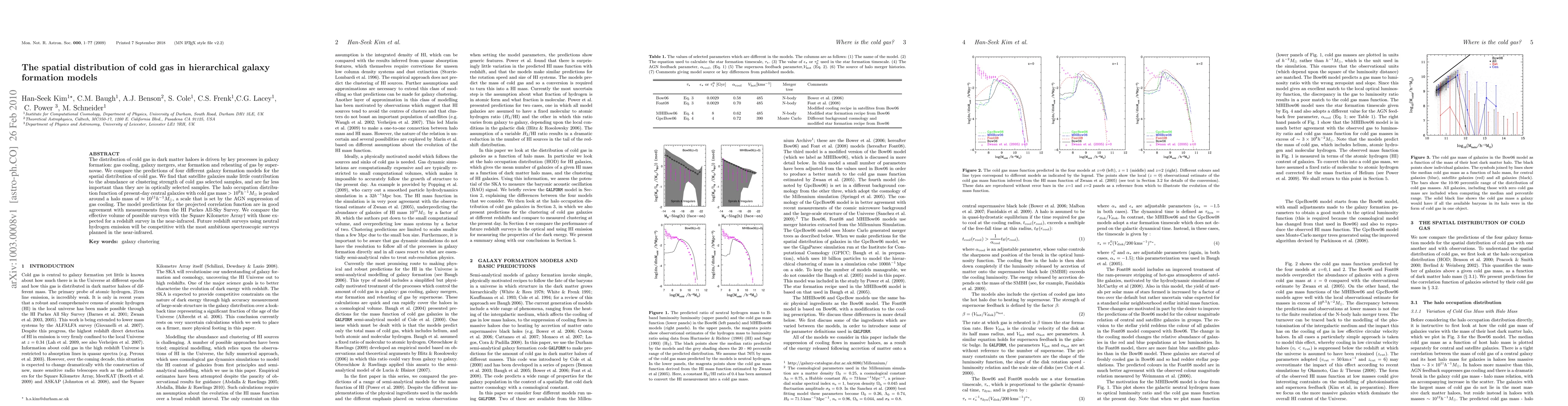 This paper examines the spatial distribution of cold gas in dark matter haloes across four galaxy formation models, finding that satellite galaxies contribute minimally to cold gas abundance. It concludes that AGN suppression sets the peak halo mass for central galaxies with significant cold gas, and predicts that future HI surveys will be competitive with near-infrared spectroscopic surveys.