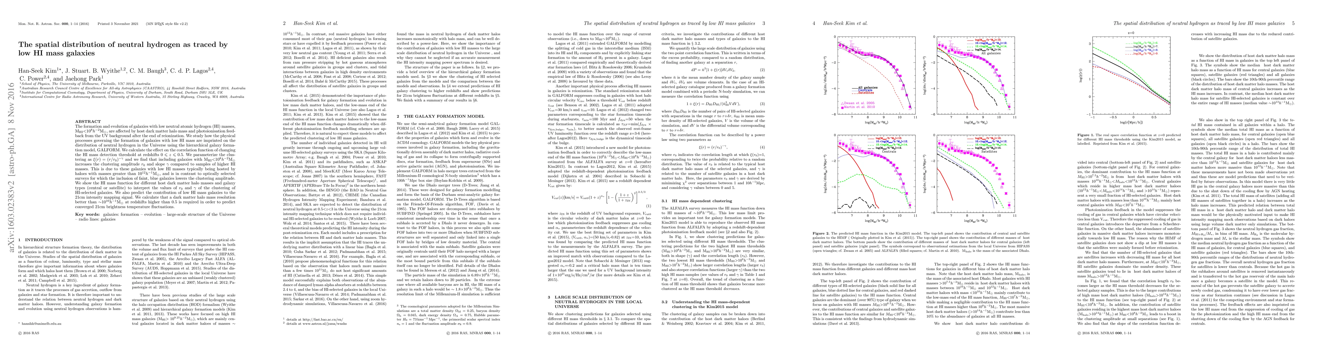 The formation and evolution of galaxies with low neutral atomic hydrogen (HI) masses, M$_{\rm HI}$$<$10$^{8}h^{-2}$M$_{\odot}$, are affected by host dark matter halo mass and photoionisation feedback from the UV background after the end of reionization. We study how the physical processes governing the formation of galaxies with low HI mass are imprinted on the distribution of neutral hydrogen in the Universe using the hierarchical galaxy formation model, GALFORM. We calculate the effect on the correlation function of changing the HI mass detection threshold at redshifts $0 \le z \le 0.5$. We parameterize the clustering as $\xi(r)=(r/r_{0})^{-\gamma}$ and we find that including galaxies with M$_{\rm HI}$$<$10$^{8}h^{-2}$M$_{\odot}$ increases the clustering amplitude $r_{0}$ and slope $\gamma$ compared to samples of higher HI masses. This is due to these galaxies with low HI masses typically being hosted by haloes with masses greater than 10$^{12}{h}^{-1}$M$_{\odot}$, and is in contrast to optically selected surveys for which the inclusion of faint, blue galaxies lowers the clustering amplitude. We show the HI mass function for different host dark matter halo masses and galaxy types (central or satellite) to interpret the values of $r_{0}$ and $\gamma$ of the clustering of HI-selected galaxies. We also predict the contribution of low HI mass galaxies to the 21cm intensity mapping signal. We calculate that a dark matter halo mass resolution better than $\sim$10$^{10}{h}^{-1}$M$_{\odot}$ at redshifts higher than 0.5 is required in order to predict converged 21cm brightness temperature fluctuations.