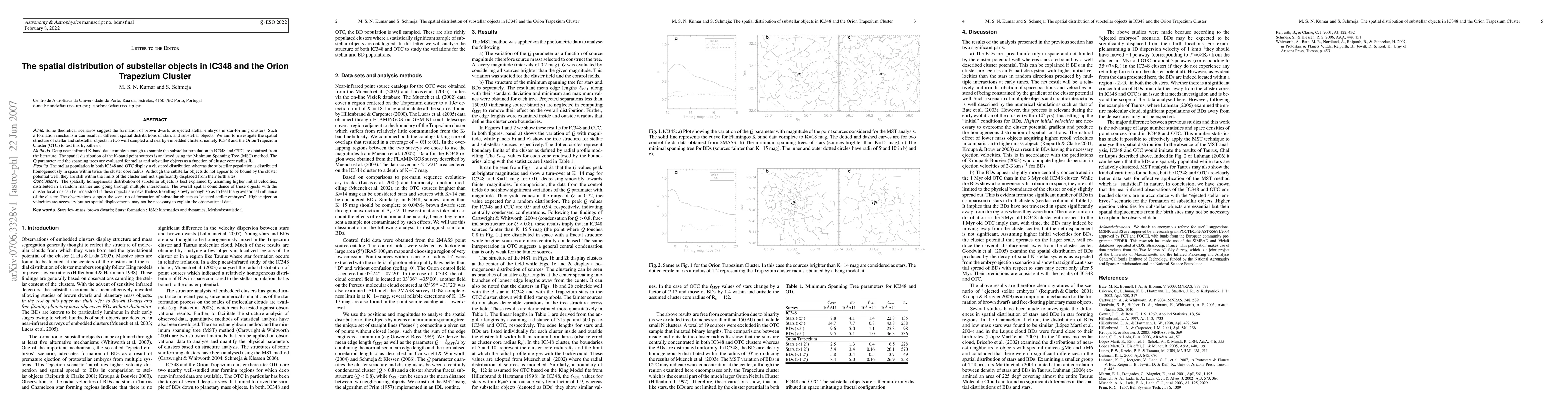Aims: Some theoretical scenarios suggest the formation of brown dwarfs as ejected stellar embryos in star-forming clusters. Such a formation mechanism can result in different spatial distributions of stars and substellar objects. We aim to investigate the spatial structure of stellar and substellar objects in two well sampled and nearby embedded clusters, namely IC348 and the Orion Trapezium Cluster (OTC) to test this hypothesis. Methods:Deep near-infrared K-band data complete enough to sample the substellar population in IC348 and OTC are obtained from the literature. The spatial distribution of the K-band point sources is analysed using the Minimum Spanning Tree (MST) method. The Q parameter and the spanning trees are evaluated for stellar and substellar objects as a function of cluster core radius R$_c$. Results: The stellar population in both IC348 and OTC display a clustered distribution whereas the substellar population is distributed homogeneously in space within twice the cluster core radius. Although the substellar objects do not appear to be bound by the cluster potential well, they are still within the limits of the cluster and not significantly displaced from their birth sites. Conclusions: The spatially homogeneous distribution of substellar objects is best explained by assuming higher initial velocities, distributed in a random manner and going through multiple interactions. The overall spatial coincidence of these objects with the cluster locations can be understood if these objects are nevertheless travelling slowly enough so as to feel the gravitational effect of the cluster. The observations support the formation of substellar objects as ``ejected stellar embryos''. Higher ejection velocities are necessary but net spatial displacements may not be necessary to explain the observational data.