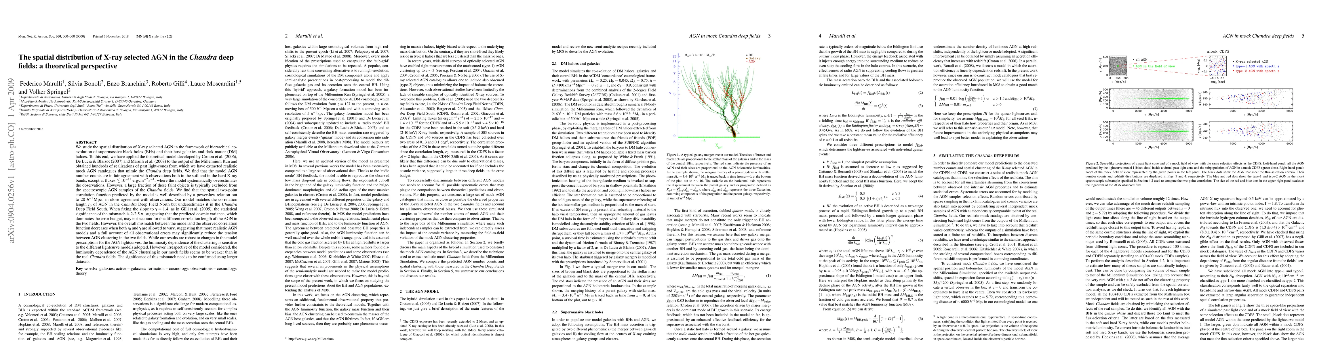 This paper investigates the spatial distribution of X-ray selected AGN using a theoretical model based on hierarchical co-evolution of black holes and galaxies. The model matches observed AGN number counts and spatial correlation functions but shows discrepancies in the correlation length between different Chandra Deep Fields.