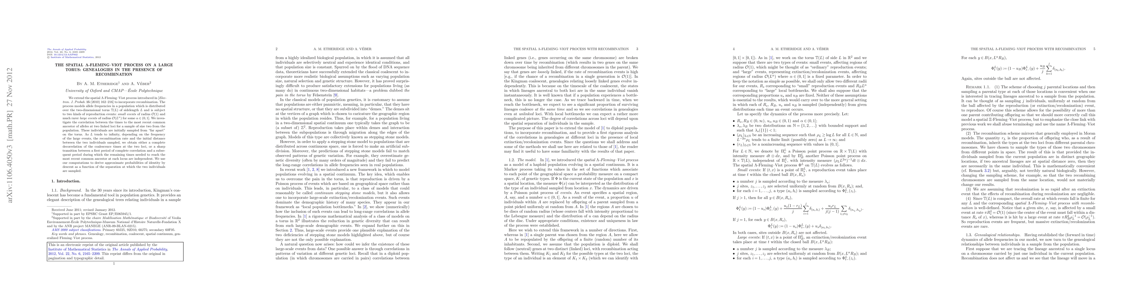 We extend the spatial $\Lambda$-Fleming-Viot process introduced in [Electron. J. Probab. 15 (2010) 162-216] to incorporate recombination. The process models allele frequencies in a population which is distributed over the two-dimensional torus $\mathbb{T}(L)$ of sidelength L and is subject to two kinds of reproduction events: small events of radius $\mathcal{O}(1)$ and much rarer large events of radius $\mathcal{O}(L^{\alpha})$ for some $\alpha\in(0,1]$. We investigate the correlation between the times to the most recent common ancestor of alleles at two linked loci for a sample of size two from the population. These individuals are initially sampled from "far apart" on the torus. As L tends to infinity, depending on the frequency of the large events, the recombination rate and the initial distance between the two individuals sampled, we obtain either a complete decorrelation of the coalescence times at the two loci, or a sharp transition between a first period of complete correlation and a subsequent period during which the remaining times needed to reach the most recent common ancestor at each locus are independent. We use our computations to derive approximate probabilities of identity by descent as a function of the separation at which the two individuals are sampled.