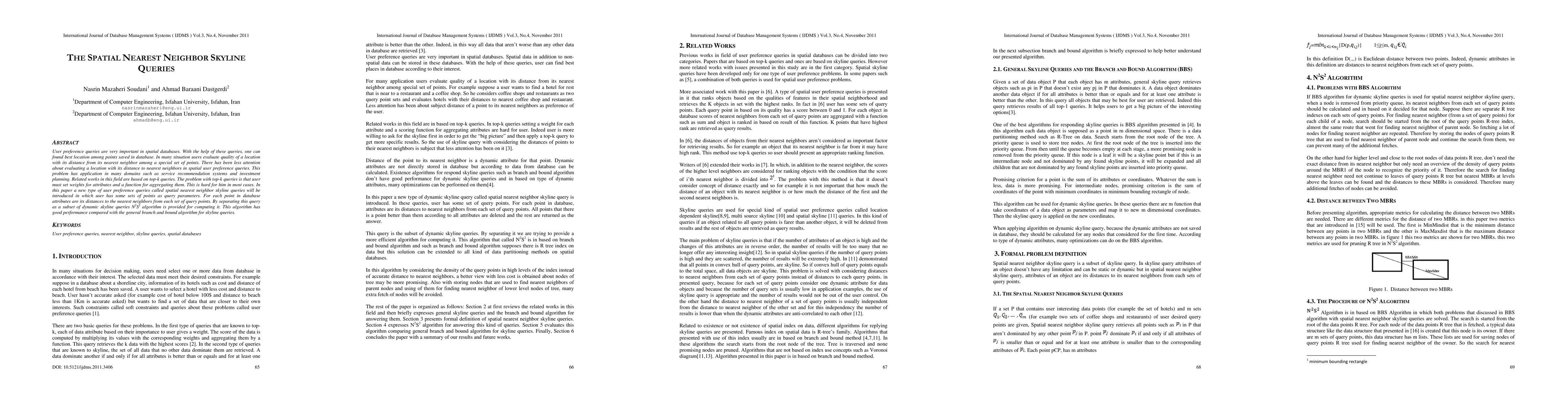 This paper introduces spatial nearest neighbor skyline queries to determine optimal locations based on their distances to specified nearest neighbor sets. The proposed N2S2 algorithm efficiently computes these queries, outperforming general skyline query methods.