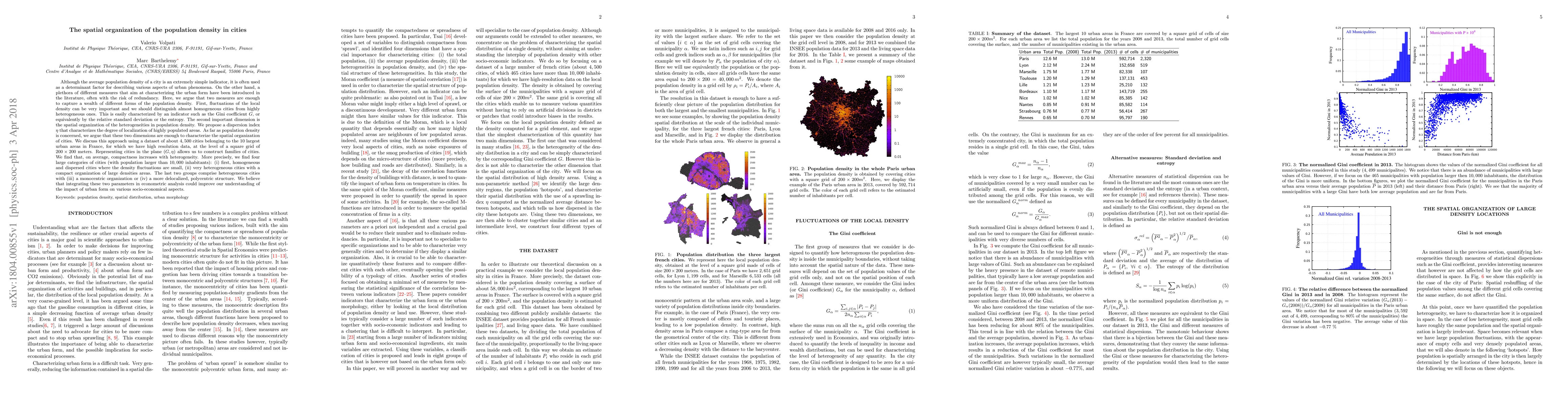 Although the average population density of a city is an extremely simple indicator, it is often used as a determinant factor for describing various aspects of urban phenomena. On the other hand, a plethora of different measures that aim at characterizing the urban form have been introduced in the literature, often with the risk of redundancy. Here, we argue that two measures are enough to capture a wealth of different forms of the population density. First, fluctuations of the local density can be very important and we should distinguish almost homogeneous cities from highly heterogeneous ones. This is easily characterized by an indicator such as the Gini coefficient $G$, or equivalently by the relative standard deviation or the entropy. The second important dimension is the spatial organization of the heterogeneities in population density and we propose a dispersion index $\eta$ that characterizes the degree of localization of highly populated areas. We argue that these two dimensions are enough to characterize the spatial organization of cities, and we discuss this approach using a dataset of about $4,500$ cities belonging to the $10$ largest urban areas in France, for which we have high resolution data. Representing cities in the plane $(G,\eta)$ allows us to construct families of cities. On average, compactness increases with heterogeneity, and we find four large categories of cities (with population $>10,000$ inhabitants): (i) first, homogeneous and dispersed cities with small density fluctuations, (ii) very heterogeneous cities with a compact organization of large densities areas. The last two groups comprise heterogeneous cities with (iii) a monocentric organization or (iv) a more delocalized, polycentric structure. Integrating these two parameters in econometric analysis could improve our understanding of the impact of urban form on various socio-economical aspects.