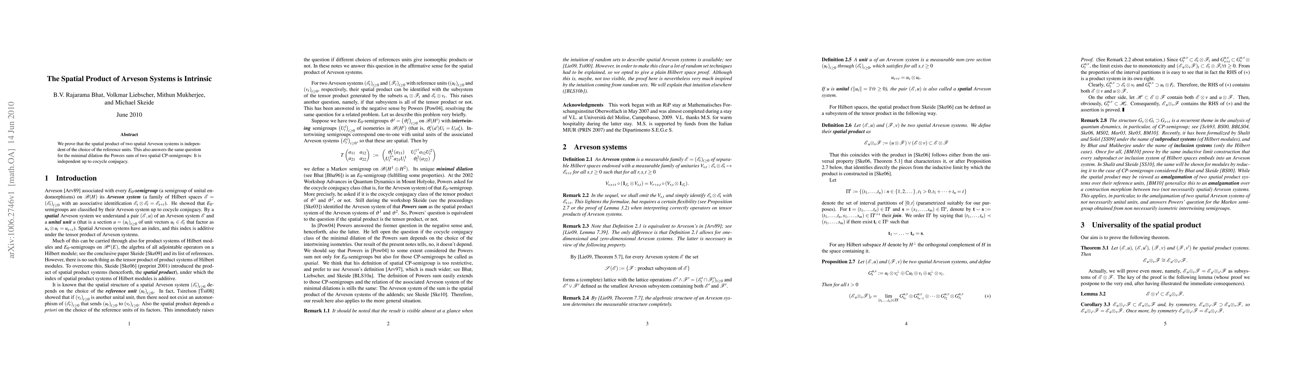 We prove that the spatial product of two spatial Arveson systems is independent of the choice of the reference units. This also answers the same question for the minimal dilation the Powers sum of two spatial CP-semigroups: It is independent up to cocycle conjugacy.