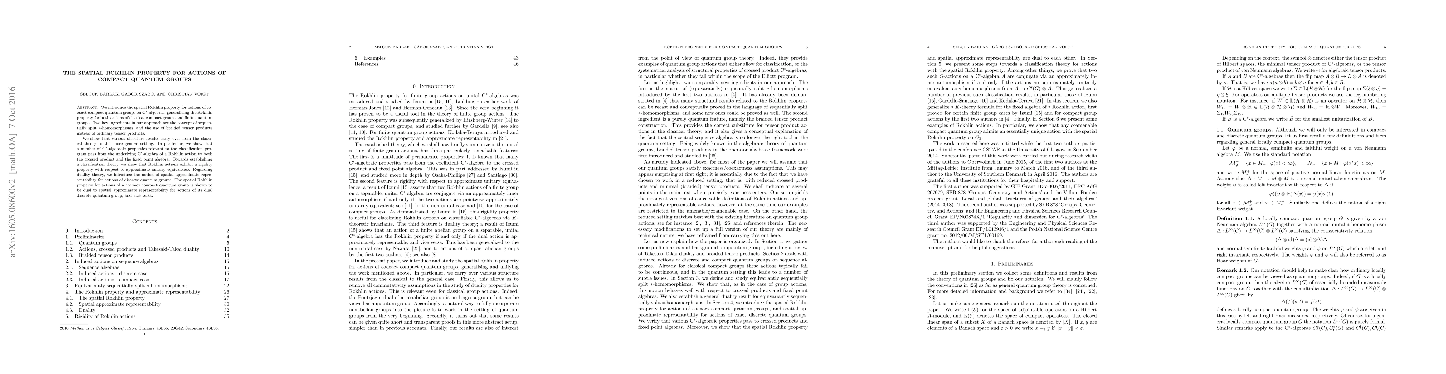 We introduce the spatial Rokhlin property for actions of coexact compact quantum groups on $\mathrm{C}^*$-algebras, generalizing the Rokhlin property for both actions of classical compact groups and finite quantum groups. Two key ingredients in our approach are the concept of sequentially split $*$-homomorphisms, and the use of braided tensor products instead of ordinary tensor products. We show that various structure results carry over from the classical theory to this more general setting. In particular, we show that a number of $\mathrm{C}^*$-algebraic properties relevant to the classification program pass from the underlying $\mathrm{C}^*$-algebra of a Rokhlin action to both the crossed product and the fixed point algebra. Towards establishing a classification theory, we show that Rokhlin actions exhibit a rigidity property with respect to approximate unitary equivalence. Regarding duality theory, we introduce the notion of spatial approximate representability for actions of discrete quantum groups. The spatial Rokhlin property for actions of a coexact compact quantum group is shown to be dual to spatial approximate representability for actions of its dual discrete quantum group, and vice versa.