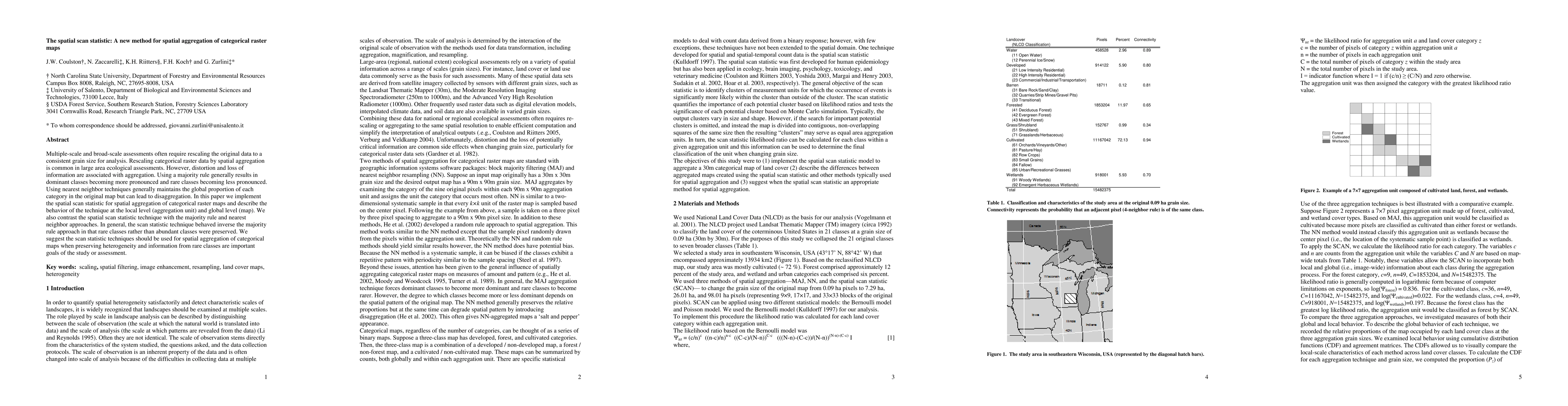 This paper introduces the spatial scan statistic method for aggregating categorical raster maps, contrasting it with majority rule and nearest neighbor techniques. The spatial scan statistic preserves rare classes better than the majority rule, making it suitable for analyses where heterogeneity and rare information are crucial.