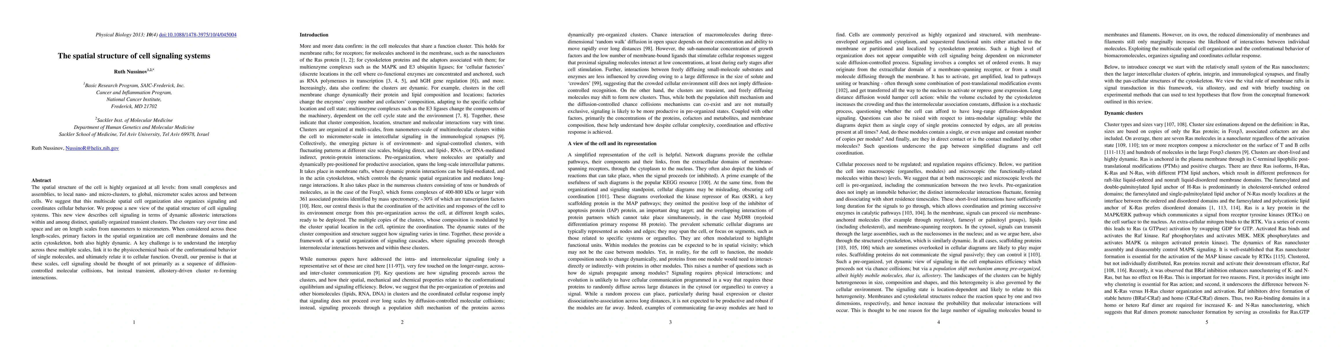 This paper proposes a new perspective on cell signaling, emphasizing its spatial organization across multiple scales, from nanometers to micrometers, driven by dynamic allosteric interactions within transient clusters. It highlights the role of cell membrane domains and the actin cytoskeleton in this spatial organization, challenging the traditional view of signaling as diffusion-controlled collisions.