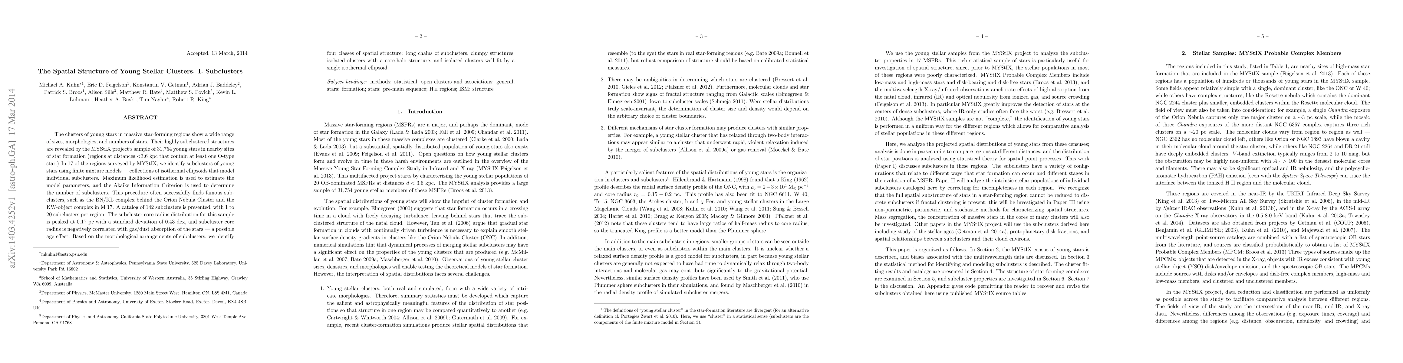 This paper identifies and analyzes subclusters within young stellar clusters in massive star-forming regions using the MYStIX project's data. It reveals a catalog of 142 subclusters, showing a peaked core radius distribution and a negative correlation with gas/dust absorption, suggesting an age effect. Four spatial structure classes are identified based on subcluster arrangements.