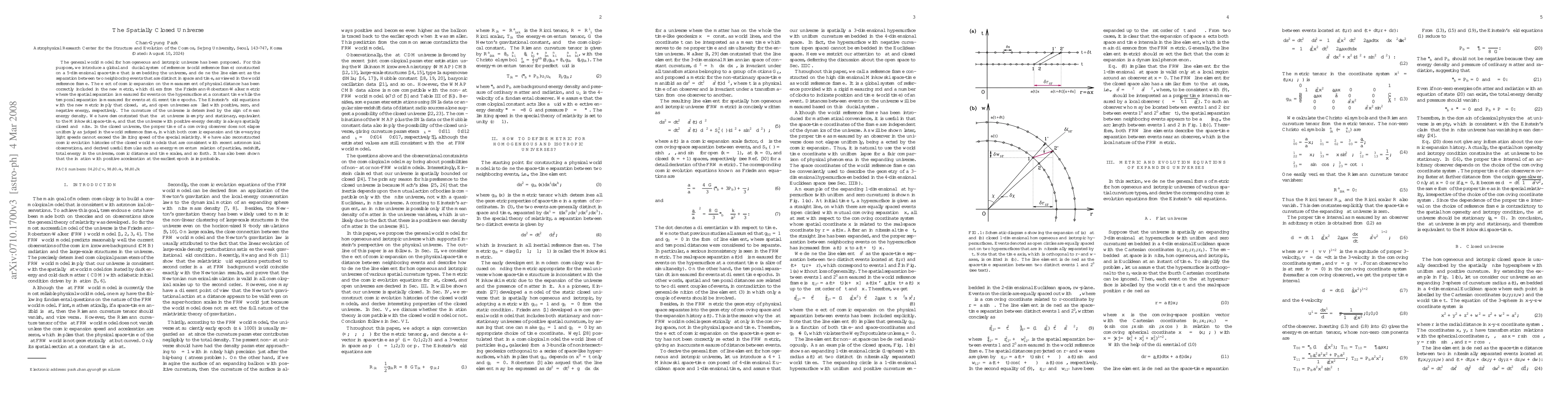 The general world model for homogeneous and isotropic universe has been roposed. For this purpose, we introduce a global and fiducial system of reference (world reference frame) constructed on a 5-dimensional space-time that is embedding the universe, and define the line element as the separation between two neighboring events that are distinct in space and time, as viewed in the world reference frame. The effect of cosmic expansion on the measurement of physical distance has been correctly included in the new metric, which differs from the Friedmann-Robertson-Walker metric where the spatial separation is measured for events on the hypersurface at a constant time while the temporal separation is measured for events at different time epochs. The Einstein's field equations with the new metric imply that closed, flat, and open universes are filled with positive, zero, and negative energy, respectively. We have demonstrated that the flat universe is empty and stationary, equivalent to the Minkowski space-time, and that the universe with positive energy density is always spatially closed and finite. In the closed universe, the proper time of a comoving observer does not elapse uniformly as judged in the world reference frame, in which both cosmic expansion and time-varying light speeds cannot exceed the limiting speed of the special relativity. We have also reconstructed cosmic evolution histories of the closed world models that are consistent with recent astronomical observations, and derived useful formulas such as energy-momentum relation of particles, redshift, total energy in the universe, cosmic distance and time scales, and so forth. It has also been shown that the inflation with positive acceleration at the earliest epoch is improbable.