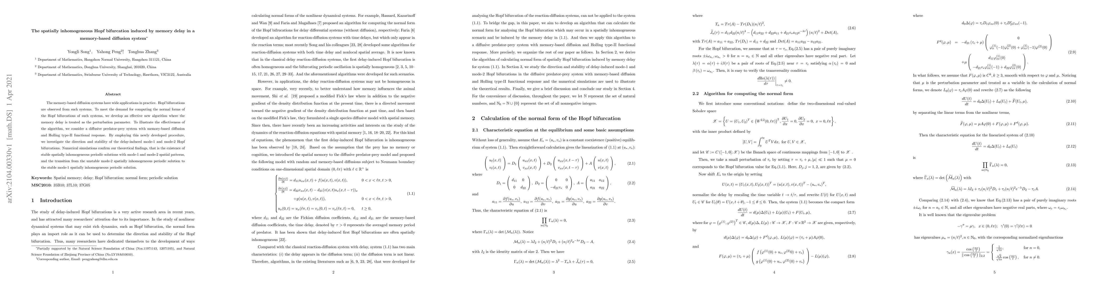 This paper develops a new algorithm to compute normal forms for Hopf bifurcations in memory-based diffusion systems, treating memory delay as a perturbation parameter. It applies this method to a diffusive predator-prey system, revealing stable spatially inhomogeneous periodic solutions and transitions between mode-1 and mode-2 spatial patterns.