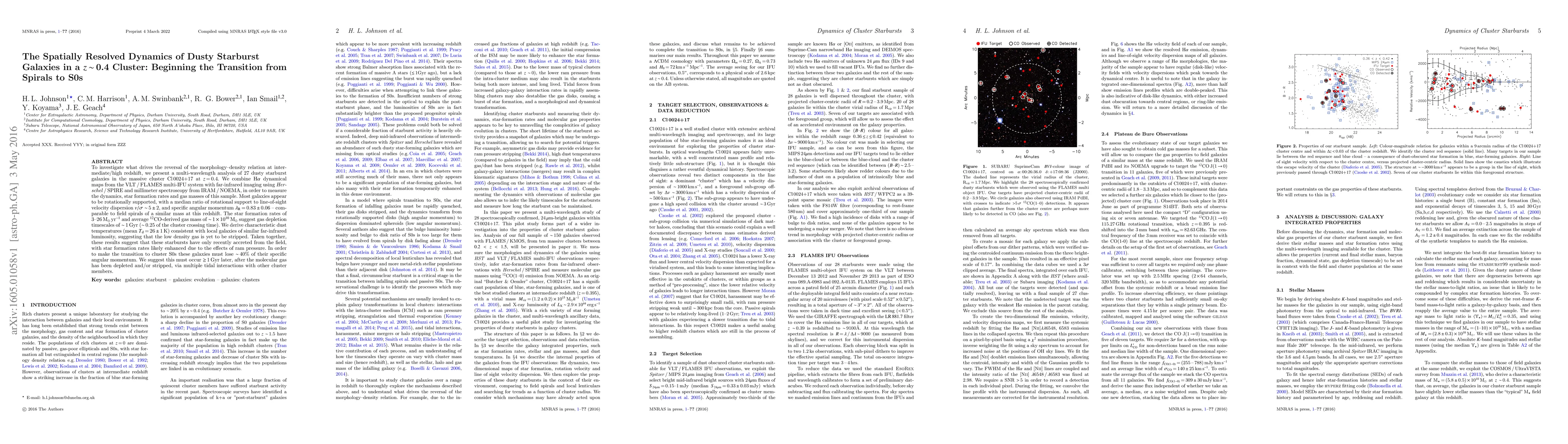 This study investigates 27 dusty starburst galaxies in a z = 0.4 cluster, finding they resemble field spirals with rotationally supported gas, and suggesting these galaxies have recently accreted from the field, likely due to ram pressure effects, before transitioning to S0s.