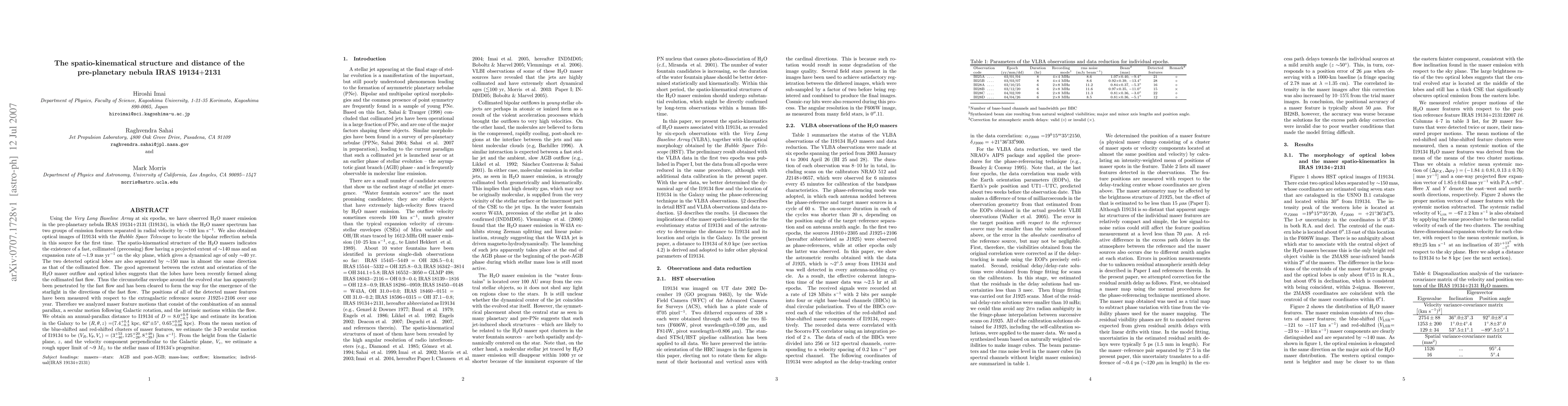 Using the VLBA, we have observed H2O maser emission in the pre-planetary nebula IRAS 19134+2131(I19134), in which the H2O maser spectrum has two groups of emission features separated in radial velocity by ~100 km/s. We also obtained optical images of I19134 with the HST to locate the bipolar reflection nebula in this source for the first time. The spatio-kinematical structure of the H2O masers indicates the existence of a fast, collimated (precessing) flow having a projected extent of ~140 mas and an expansion rate of ~1.9 mas/yr on the sky plane, which gives a dynamical age of only ~40 yr. The two detected optical lobes are also separated by ~150 mas in almost the same direction as that of the collimated flow. The good agreement between the extent and orientation of the H2O maser outflow and optical lobes suggests that the lobes have been recently formed along the collimated fast flow. The positions of all of the detected maser features have been measured with respect to the reference source J1925+2106 over one year. Therefore we analyzed maser feature motions that consist of the combination of an annual parallax, a secular motion following Galactic rotation, and the intrinsic motions within the flow. We obtain an annual-parallax distance to I19134 of D~8 kpc kpc and estimate its location in the Galaxy to be (R, theta, z)=(7.4 kpc, 62 deg, 0.65 kpc). From the mean motion of the blue-shifted and red-shifted clusters of maser features, we estimate the 3-D secular motion of I19134 to be (V_{R}, V_{theta}, V_{z})=(3, 125, 8) [km/s]. From the height from the Galactic plane, z, and the velocity component perpendicular to the Galactic plane, V_{z}, we estimate a rough upper limit of ~9 M_{sun} to the stellar mass of I19134's progenitor.