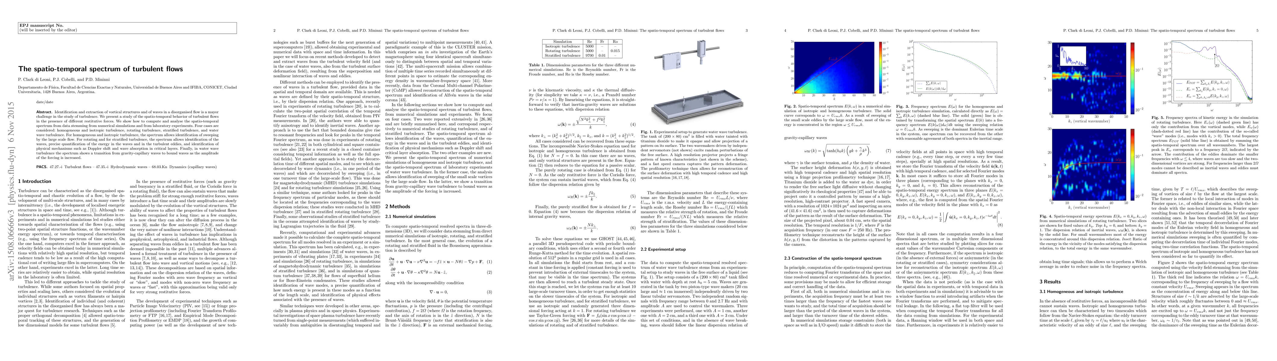 This paper investigates the spatio-temporal spectrum of turbulent flows under various forces, identifying vortical structures and waves through numerical simulations and experiments. It highlights the spectrum's ability to reveal large-scale flow effects, wave energy quantification, and physical mechanisms in different types of turbulence.