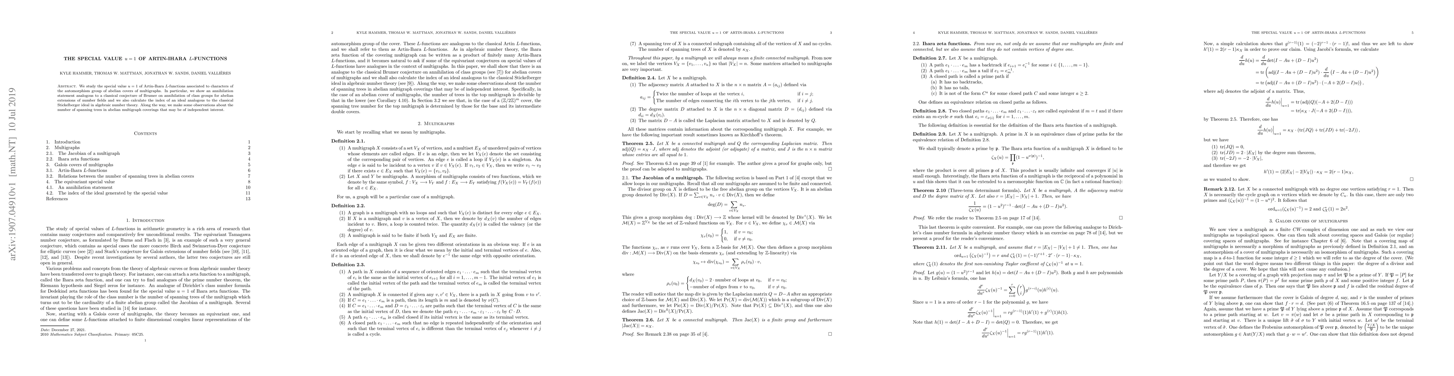 The research studies the special value $u=1$ of Artin-Ihara $L$-functions associated with characters of the automorphism group of abelian covers of multigraphs, using analytical and algebraic techniques from number theory and graph theory.