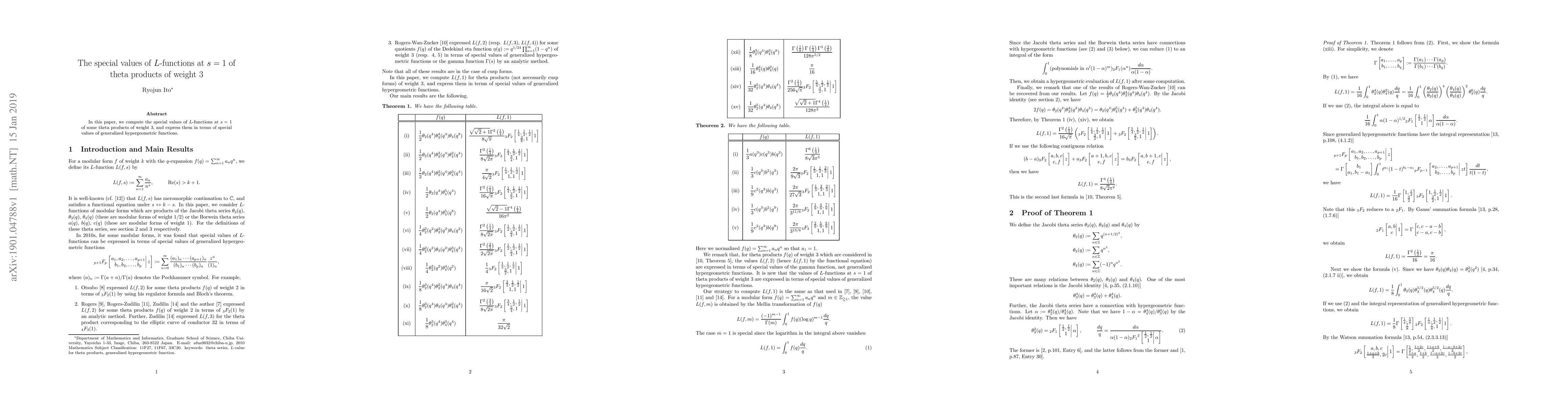 This paper calculates the special values of $L$-functions at $s=1$ for certain theta products of weight 3, and represents these values using generalized hypergeometric functions.