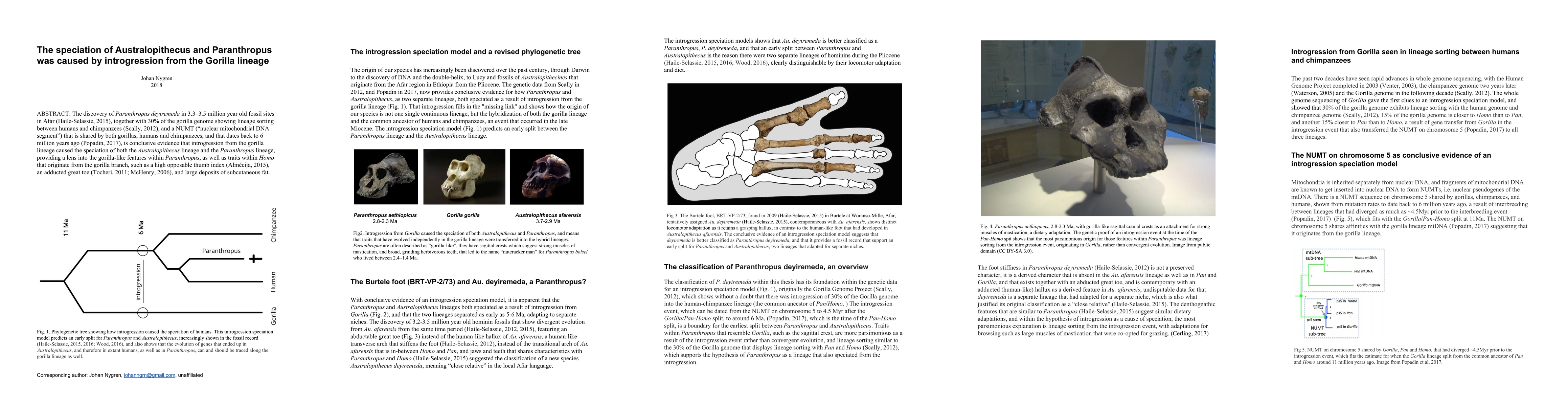 This paper argues that introgression from the gorilla lineage led to the speciation of Australopithecus and Paranthropus, evidenced by shared NUMTs and gorilla-like anatomical traits in these lineages. The discovery of Paranthropus deyiremeda and genetic lineage sorting between humans and chimpanzees further support this hypothesis.