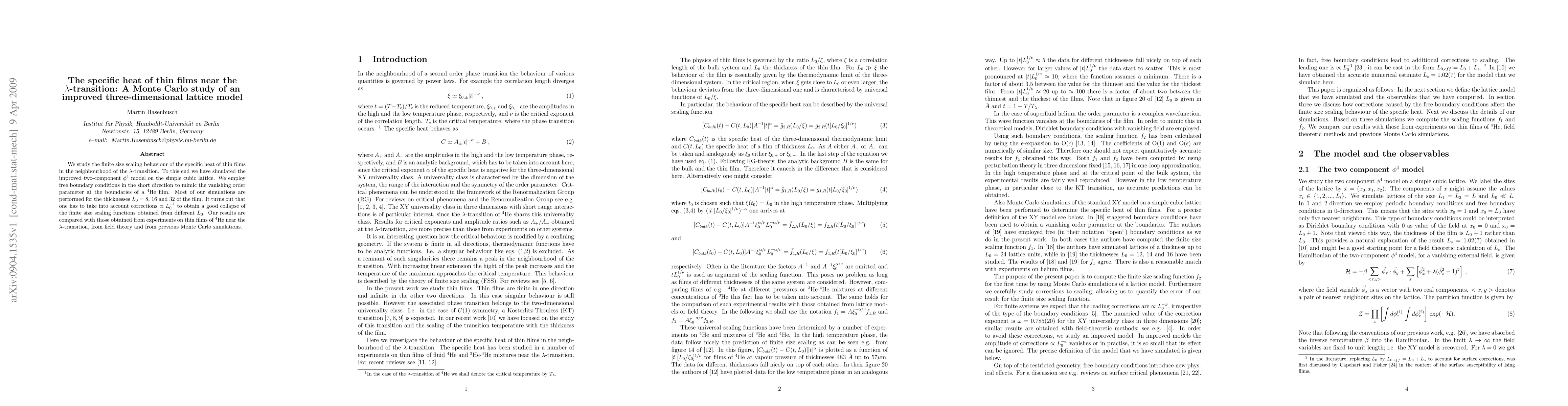 This paper investigates the specific heat behavior of thin films near the lambda-transition using Monte Carlo simulations of an improved three-dimensional lattice model. The study reveals that corrections proportional to 1/L_0 are necessary for accurate finite size scaling, and results are compared with experimental and theoretical data.