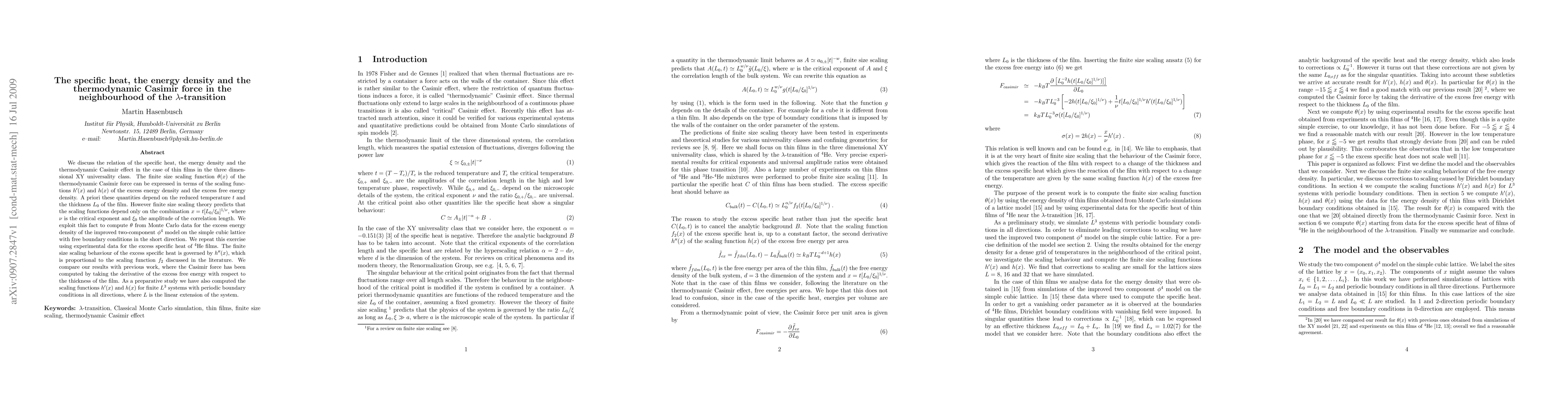 This paper investigates the relationships between specific heat, energy density, and the thermodynamic Casimir effect in thin films near the lambda-transition, using finite size scaling theory. It computes the scaling function for the thermodynamic Casimir force from Monte Carlo data and experimental data for 4He films, comparing results with previous methods.