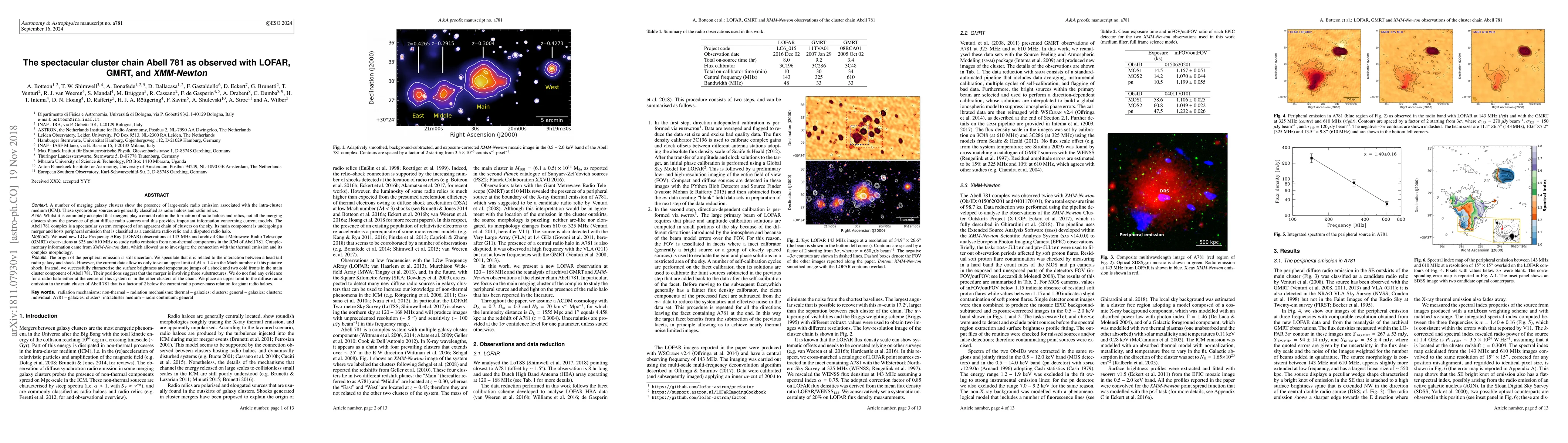 The research on Abell 781, a merging cluster chain, utilized LOFAR, GMRT, and XMM-Newton data to study radio and thermal emissions. The study found no definitive radio halo in the main cluster but identified a candidate radio relic and a disputed radio halo. It also characterized shock and cold front features, suggesting a three-substructure merger. Upper limits were set for the Mach number of a potential shock and for diffuse radio emission, which was absent or below typical levels.