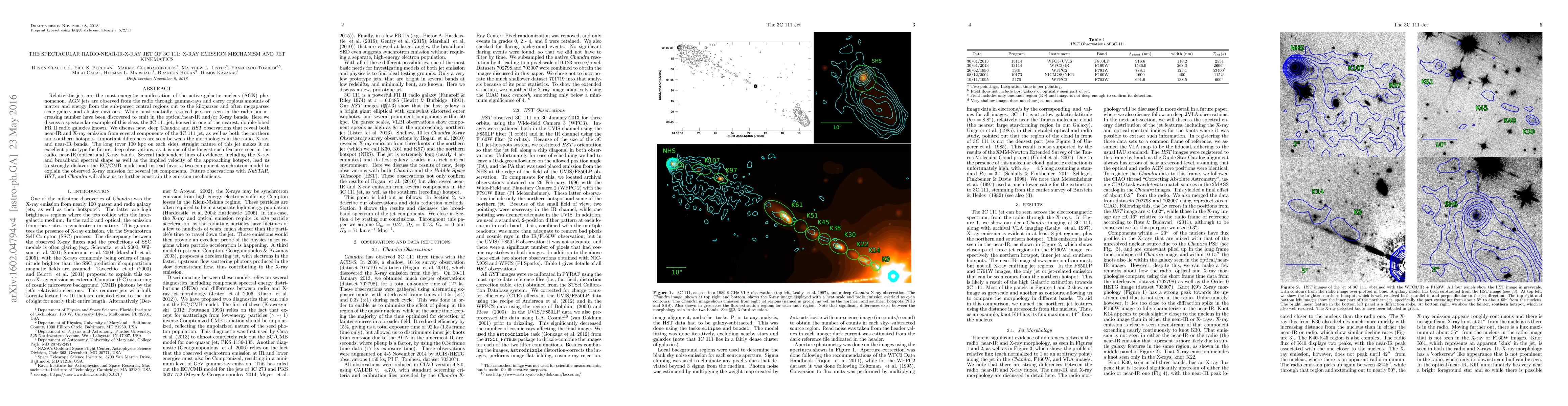 This paper investigates the 3C 111 jet, a relativistic AGN jet observed across radio, near-IR, and X-ray wavelengths, revealing distinct morphologies in each band. The study favors a two-component synchrotron model over the EC/CMB model to explain the X-ray emission, based on spectral and kinematic evidence.