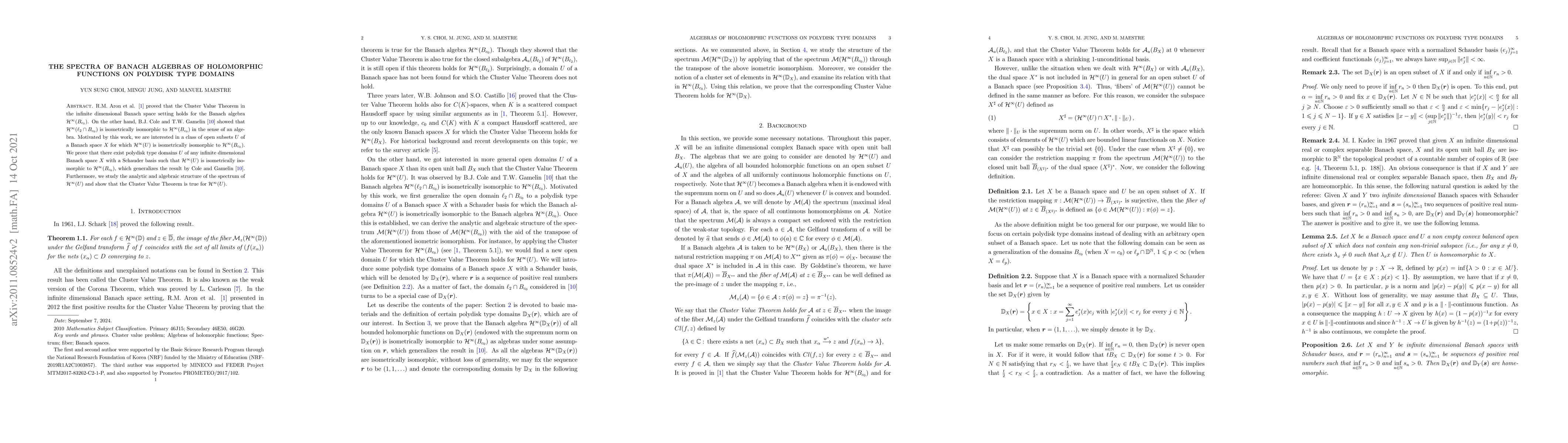 This paper proves that polydisk type domains in infinite-dimensional Banach spaces with a Schauder basis can be isometrically isomorphic to $\mathcal{H}^\infty (B_{c_0})$, generalizing previous results. It also examines the spectrum of $\mathcal{H}^\infty (U)$ and confirms the validity of the Cluster Value Theorem for these algebras.
