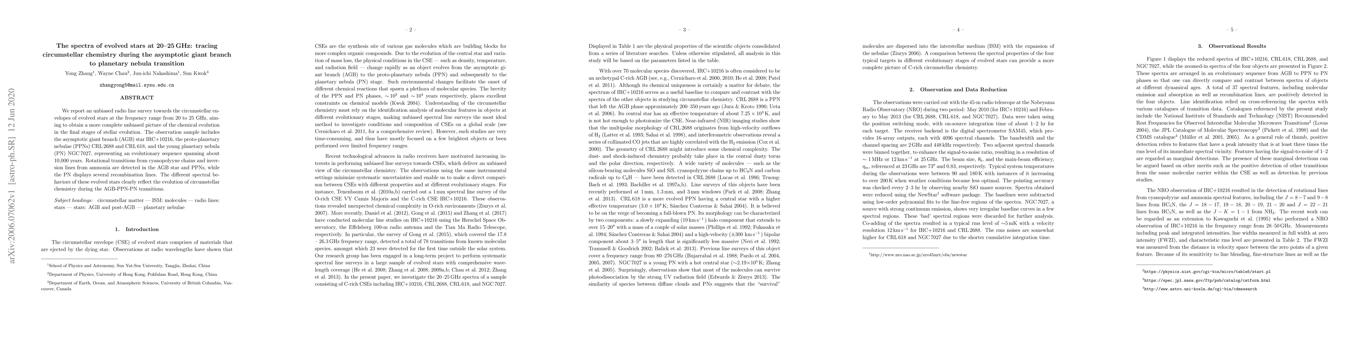 We report an unbiased radio line survey towards the circumstellar envelopes of evolved stars at the frequency range from 20 to 25 GHz, aiming to obtain a more complete unbiased picture of the chemical evolution in the final stages of stellar evolution. The observation sample includes the asymptotic giant branch (AGB) star IRC+10216, the proto-planetary nebulae (PPNs) CRL\,2688 and CRL\,618, and the young planetary nebula (PN) NGC\,7027, representing an evolutionary sequence spanning about 10,000 years. Rotational transitions from cyanopolyyne chains and inversion lines from ammonia are detected in the AGB star and PPNs, while the PN displays several recombination lines. The different spectral behaviors of these evolved stars clearly reflect the evolution of circumstellar chemistry during the AGB-PPN-PN transitions.