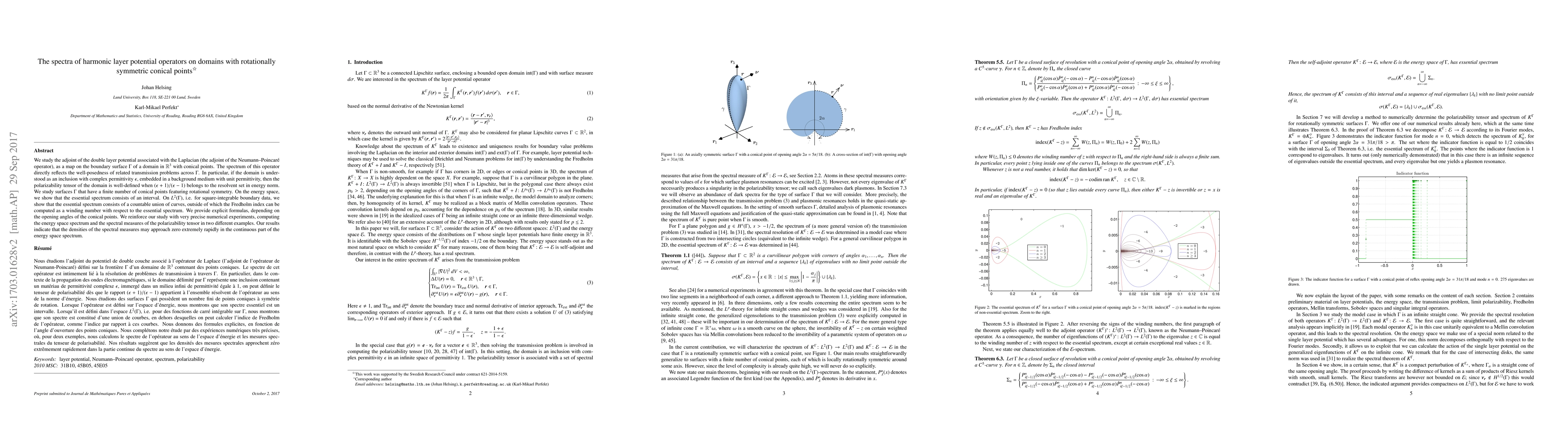 This paper investigates the spectra of harmonic layer potential operators on domains with rotationally symmetric conical points, showing that the essential spectrum is an interval on the energy space and a countable union of curves on $L^2(\Gamma)$. It provides explicit formulas for the Fredholm index and supports findings with precise numerical experiments.