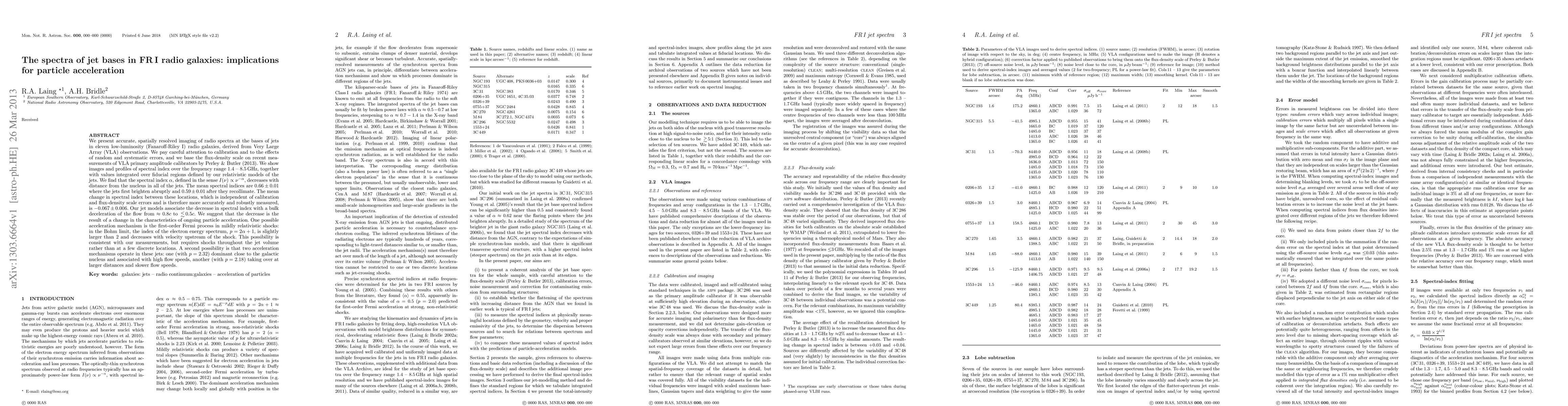 The study presents VLBA observations of radio spectra at FR I radio galaxy jet bases, revealing spectral index decrease with distance from the nucleus. This change, independent of calibration errors, suggests bulk flow deceleration from 0.8c to less than 0.5c, possibly due to modified particle acceleration mechanisms like first-order Fermi process in mildly relativistic shocks or distinct acceleration mechanisms operating at different jet regions.