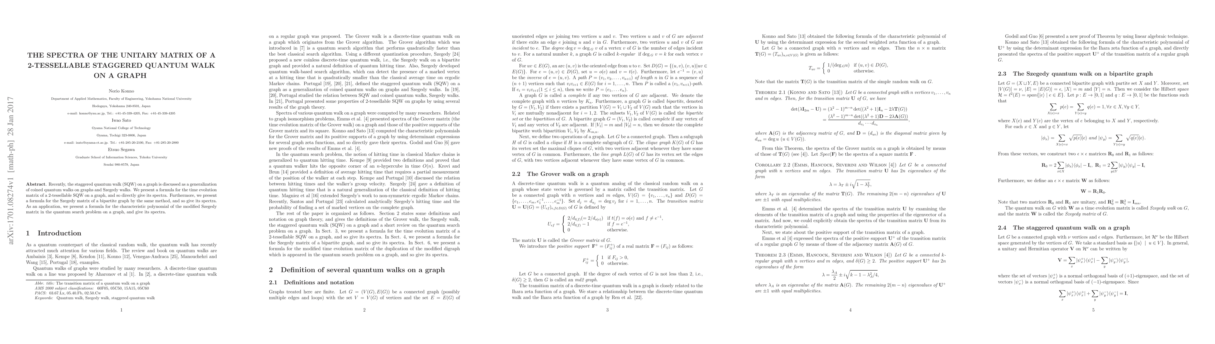 Recently, the staggered quantum walk (SQW) on a graph is discussed as a generalization of coined quantum walks on graphs and Szegedy walks. We present a formula for the time evolution matrix of a 2-tessellable SQW on a graph, and so directly give its spectra. Furthermore, we present a formula for the Szegedy matrix of a bipartite graph by the same method, and so give its spectra. As an application, we present a formula for the characteristic polynomial of the modified Szegedy matrix in the quantum search problem on a graph, and give its spectra.